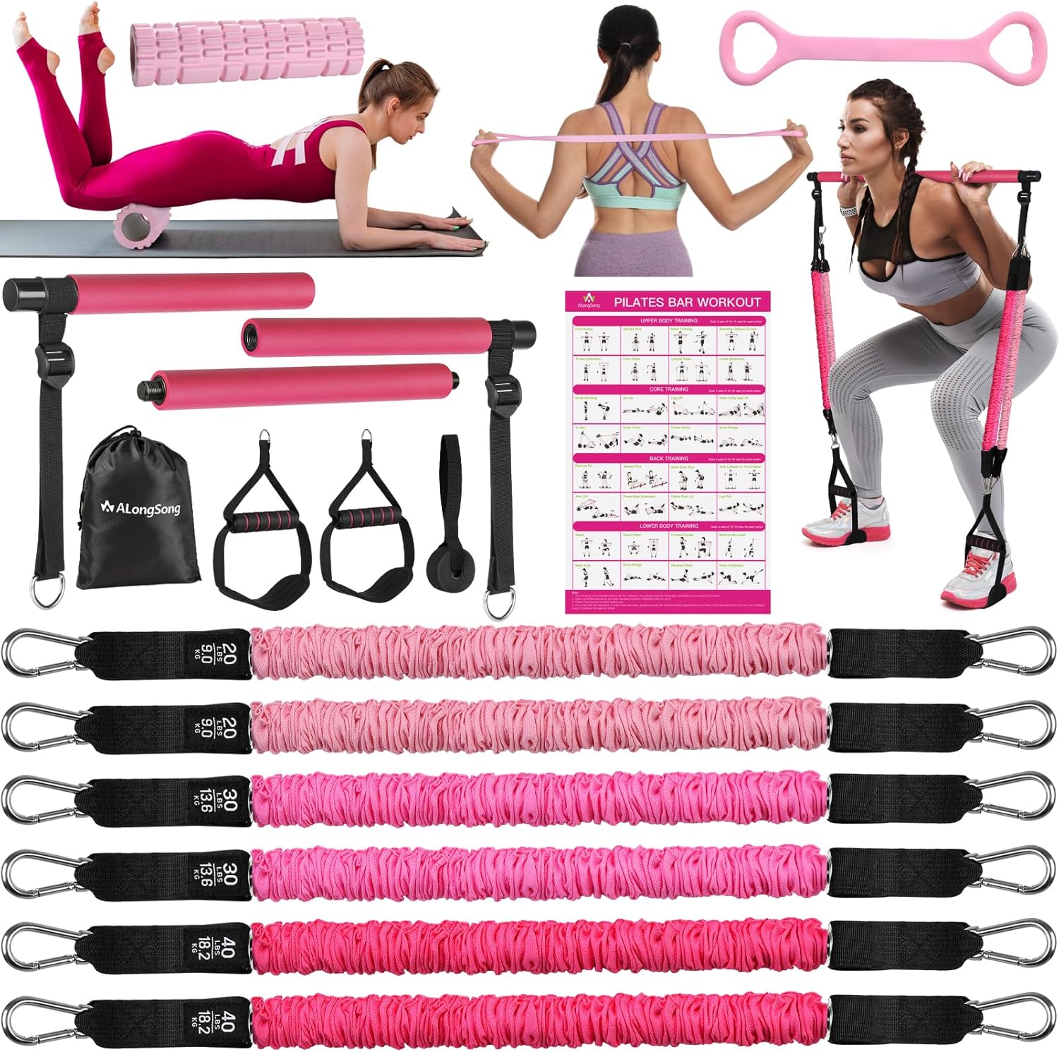 - 【No Age or Height Restrictions】ALongSong Home Fitness Set is suitable for individuals with a height of 5’-5.8’ feet. If you feel insufficient resistance during use, you can cross-use the resistance bands, adjust the length of the woven bands attached to the Pilates bar, and add resistance bands of different poundages (20/30/40LBS *2). We provide instructional diagrams, making it easy for both beginners and advanced users to quickly get started.