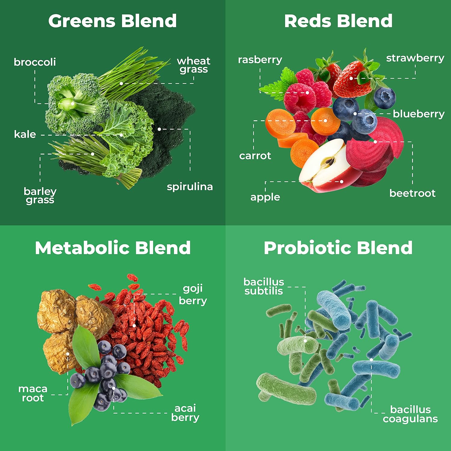 - EASES DIGESTION - These green juice powder packets contain two powerful, gut-boosting strains. Bacillus coagulans promotes healthy digestion, while Bacillus subtilis help restore gut flora and protect you from "bad bugs" from upsetting your natural balance.