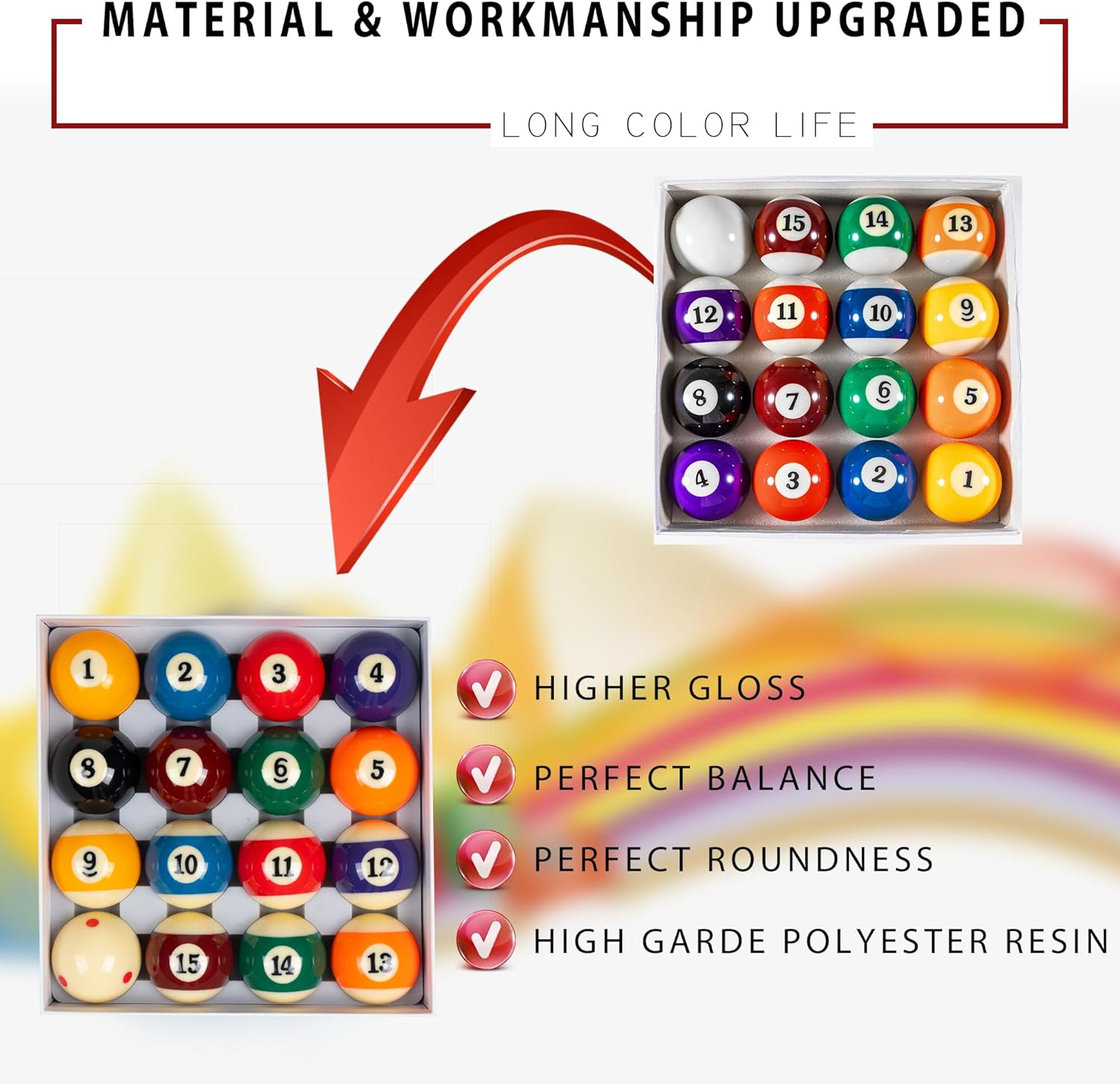 - Set includes 16 pool balls,1-15 ball and 1 cue ball with 6 red dots,The set comes with a collapsar pure white box.