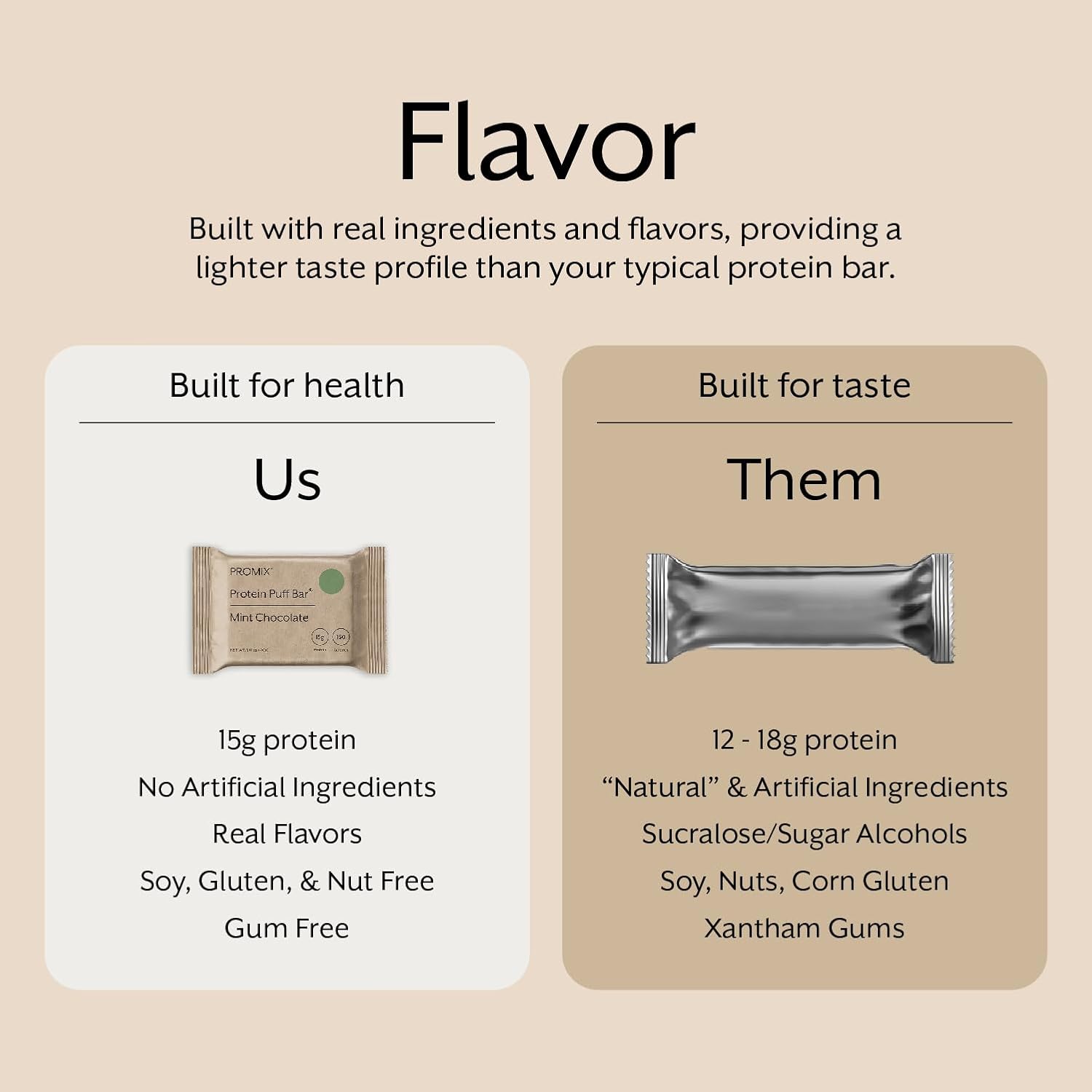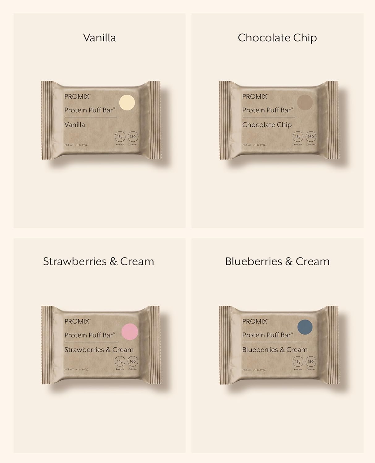 - A High-Protein Treat: ProMix Protein Puff Bars combine our Whey Protein Puffs and marshmallow for a tasty, rice Krispy-like snack with 15g of protein and just 5g of sugar β 40% less than the leading protein bar. Vanilla, Chocolate, Strawberry, and Blueberry flavor. 12 bars per box.