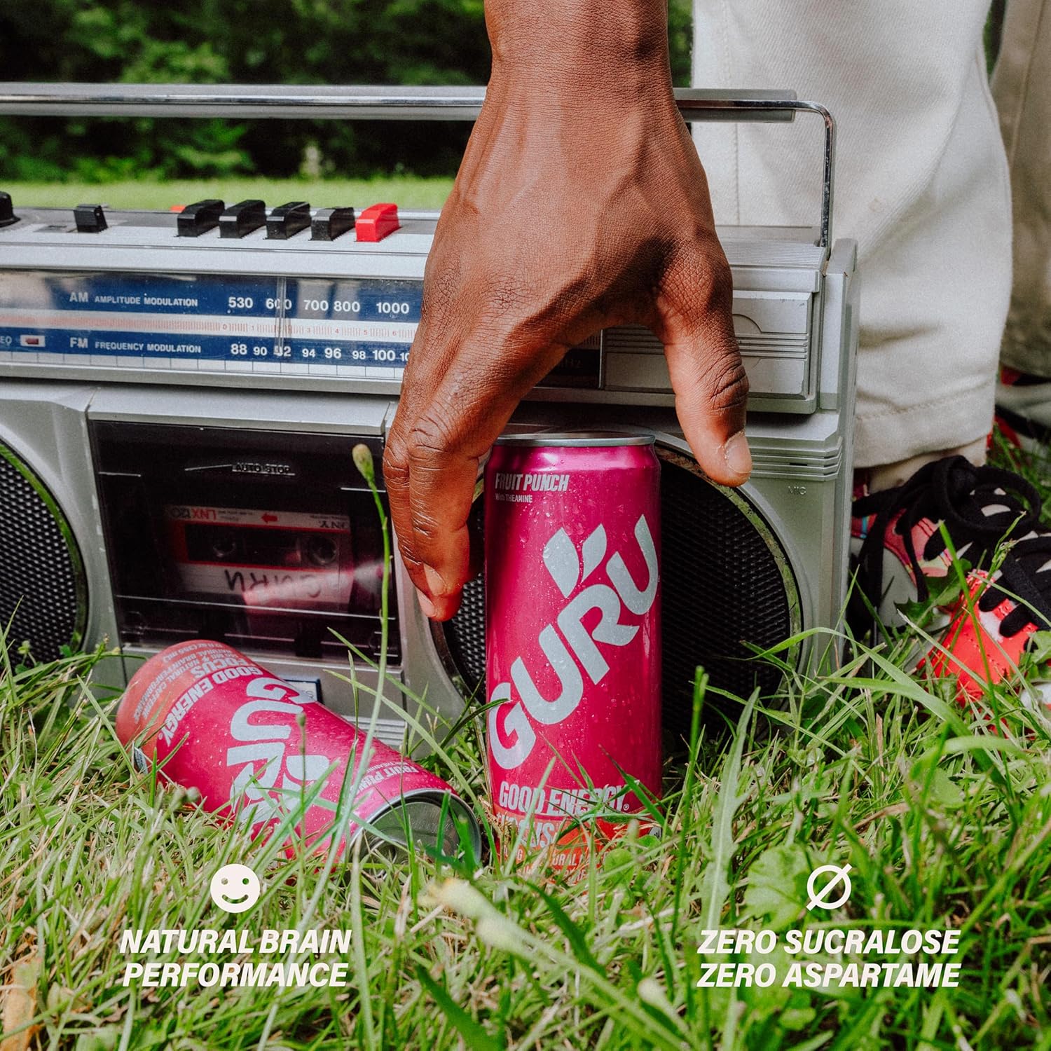 GURU Fruit Punch Organic Energy Drinks, Clean Energy Drink with Plant Based Natural Caffeine from Green Tea + Focus with L Theanine, Gluten Free and Vegan, 140MG Caffeine, 12oz (Pack of 24)