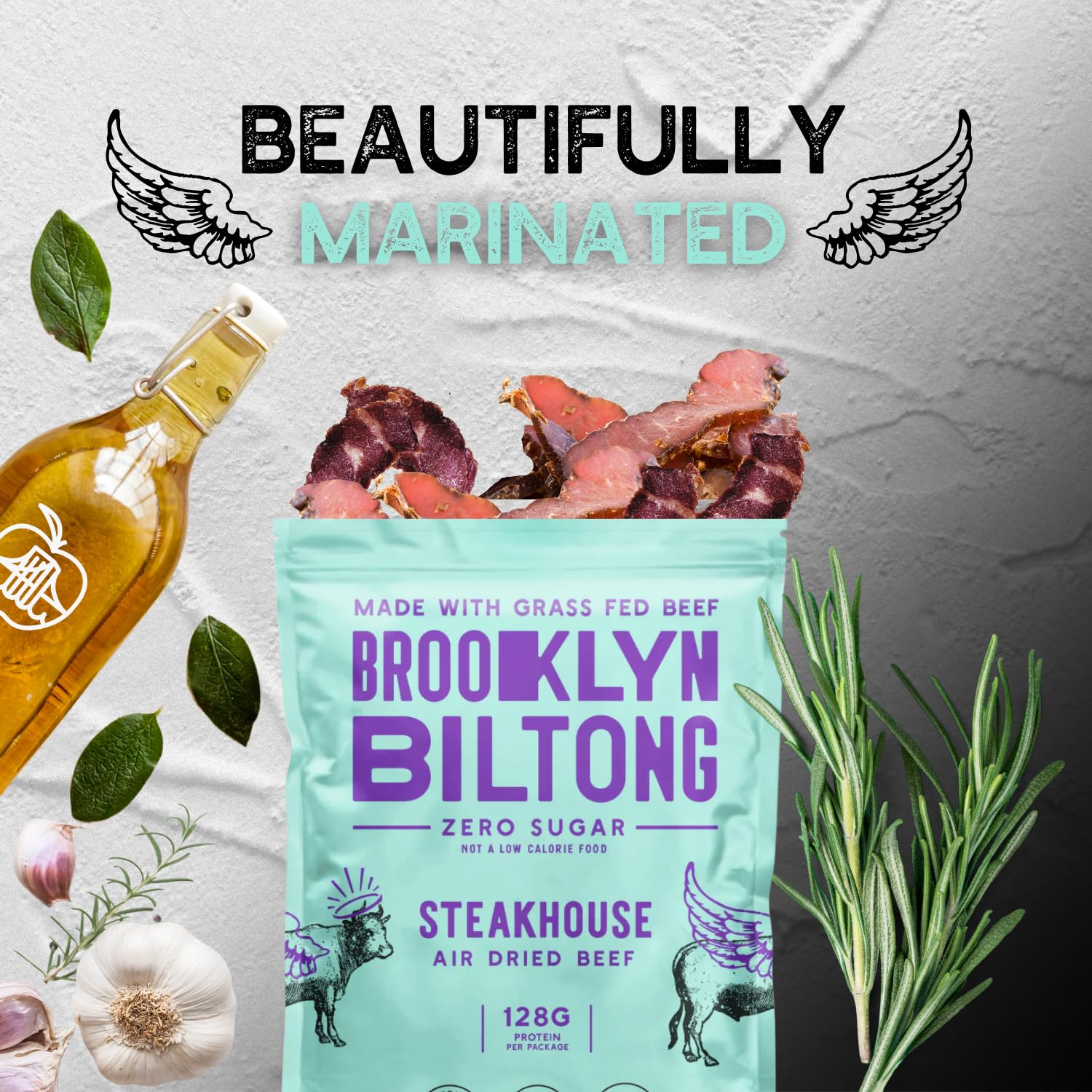 - NUTRITIOUS - With 240g of protein per bag and 0g carbs, Brooklyn Biltong is a healthy, natural snack. Unlike most processed jerky, it's made with grass-fed beef, and it's always sugar free, nitrate free, and gluten free.