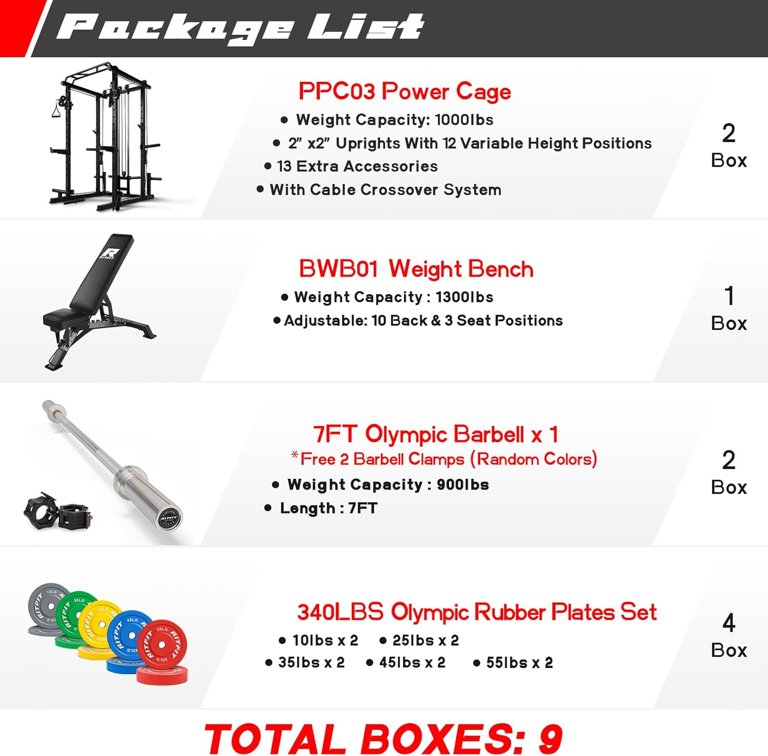 - What's in the package - RitFit PPC03 Power Cage with Cable Crossover System *1; RitFit Adjustable Weight Bench *1; RitFit 2 inch Olympic Barbell *1; RitFit 340LBS Colorful Olympic Bumper Plates Set (10lbs *2, 25lbs *2, 35lbs *2, 45lbs *2οΌ55lbs *2); Free Collars *2