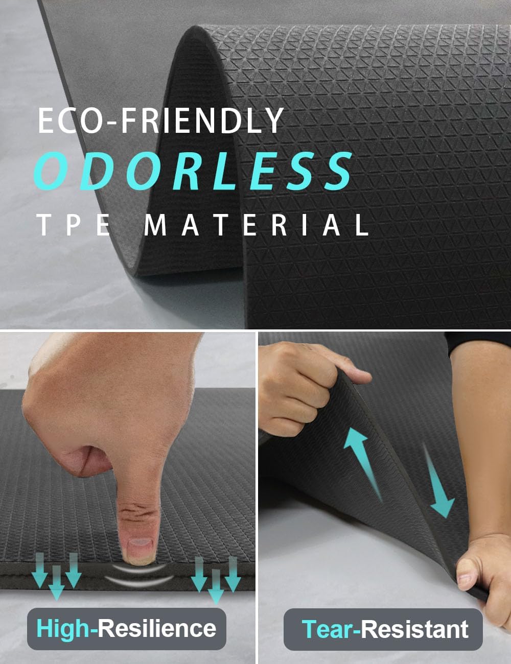 - WIDER AND LONGER FOR MORE SPACE -- Longer and wider than regular yoga mats, ideal almost for everyone. Comes with a dual-use strap, which can use as a yoga mat carry strap, or as a yoga stretching strap