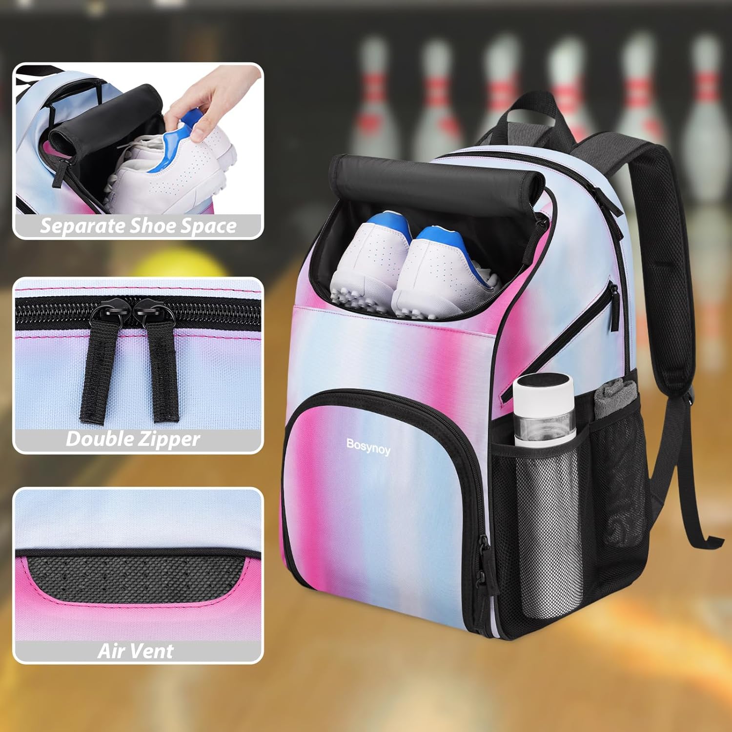 - Multiple Pockets for Sufficient Space: The Bosynoy bowling ball backpack has enough space to store all your bowling accessories & equipment. 1 front compartment to hold 1 bowling ball and 1 shoe compartment for a pair of bowling shoes. 1 more on the back can easily store towels or clothes. 2 side zipper pockets and 2 vent pockets on each side are perfect to store wallets, keys, water bottle and other small items