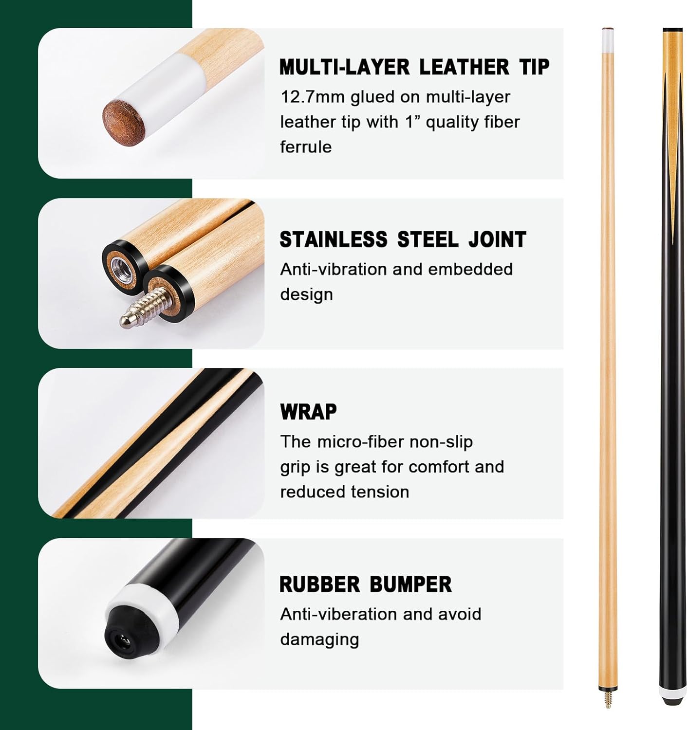 - What You Will Get: the package comes with 55 pieces of pool table accessories, including 16 pool table balls, 1 triangle billiard ball holder, 1 diamond billiard ball holder, 2 billiard pool table rail brushes, 1 billiards bridge head, 1 pool cue holder, 1 billiard bottle with 10 tally balls, 4 pool cue tips, 4 pool cue chalks, 2 cue chalk holders, 6 sets of two piece pool cues totaling 12 pieces, enough quantity and complete set to meet your using need