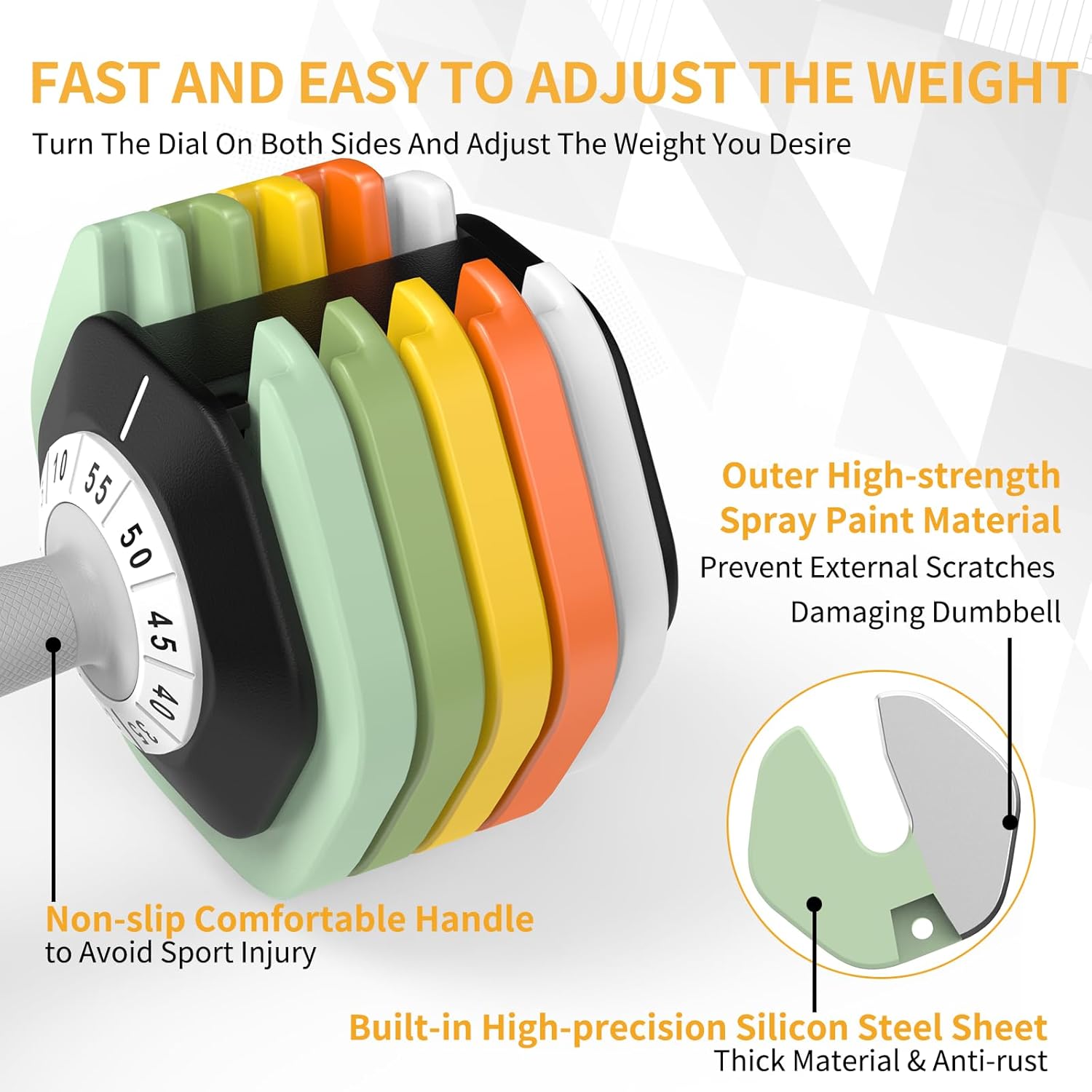 - 🥇【New Structural Design】Exclusive design of adjustment countweight plate, simply adjust by holding the handleaccording to the weight you need, turn the pointer to the corresponding number to adjust. The latest design locks the dumbbells with 8 locking, which ensure the dumbell set are fastened stably and tightly to ensure your safety.