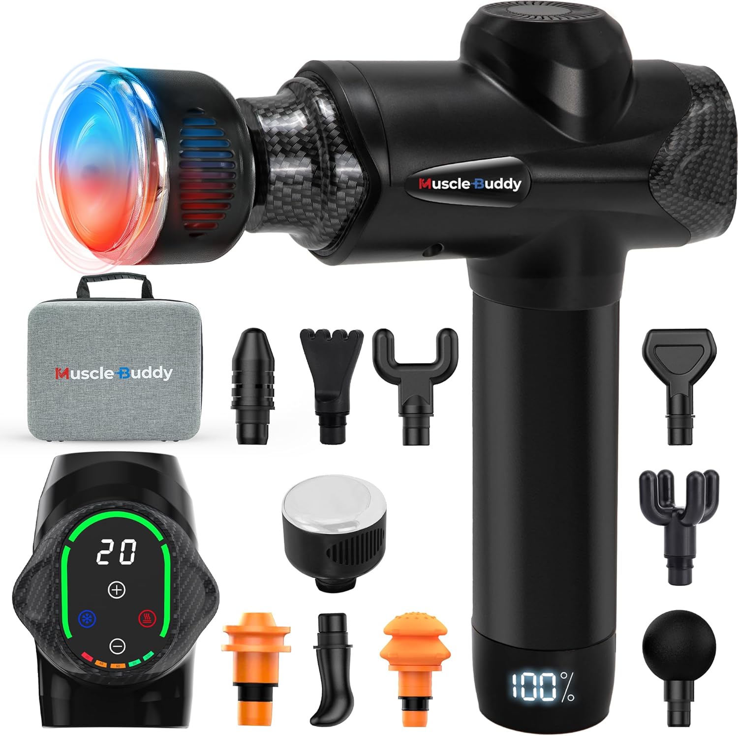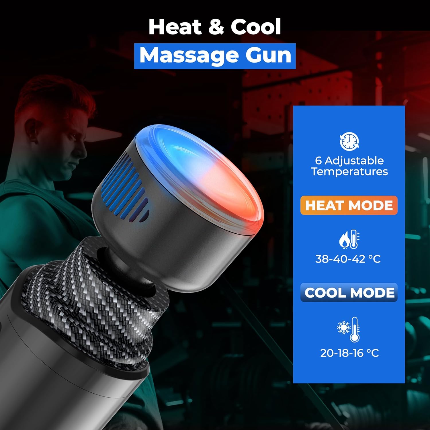- Heat and Cold Therapy: Massage gun with heat cold relieve muscle tension. Recover faster with the MuscleBuddy Massage Gun's heat and cold therapy. Heat therapy promotes blood circulation, while the Cold Therapy mode helps reduce inflammation and swelling. 1 Heating and Cooling Head & 9 Standard Massage Heads MuscleBuddy Massager Gun Deep Tissue comes with a heating and cooling massage head that can heat up to 107°F (42°C) or cool down to 61 ℉ (16°C) for deeper muscle relaxation and stress relief