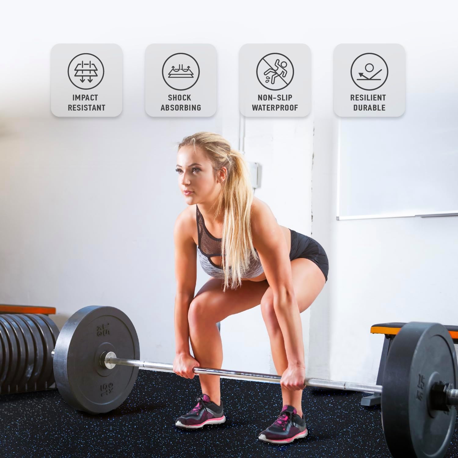 - [Upgraded Dual-Layer Design]: Concerned about your equipment scratching the floor during workouts? Our 2in1 Rubber Top EVA Foam Exercise Gym Mats are crafted to solve this issue. The textured rubber top layer, combined with a high-density EVA foam bottom layer, seamlessly creates a non-slip tough surface with excellent shock absorption.