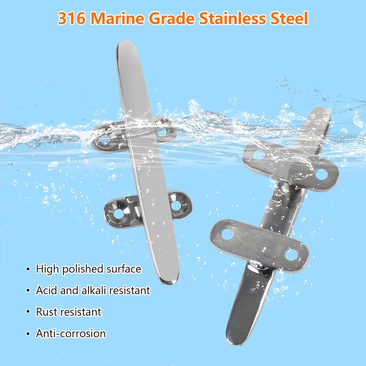 - 【High Quality 316 Stainless Steel Cleats 】Boat cleat is made of 316 marine grade stainless steel,these products are strict tested to ensure the best quality,maximum corrosion resistancein the saltwater environment.The design of the dock cleat is simple and fashionable,moisture resistance,acid and alkali resistant, rust resistant,high quality and good design are safe and reliable that it could bear high strength power from rope and make sure sturdy using for outdoors activities.