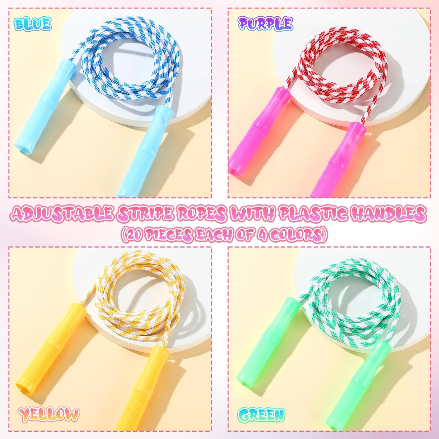 - Ample Amount in Vibrant Colors: with 80 bulk jump ropes in 4 colors, red, blue, green, and yellow, 20 for each color, our set ensures an abundant supply to meet your exercise and replacement needs; Share these ropes with your classmates or students and enjoy the fun of group activities