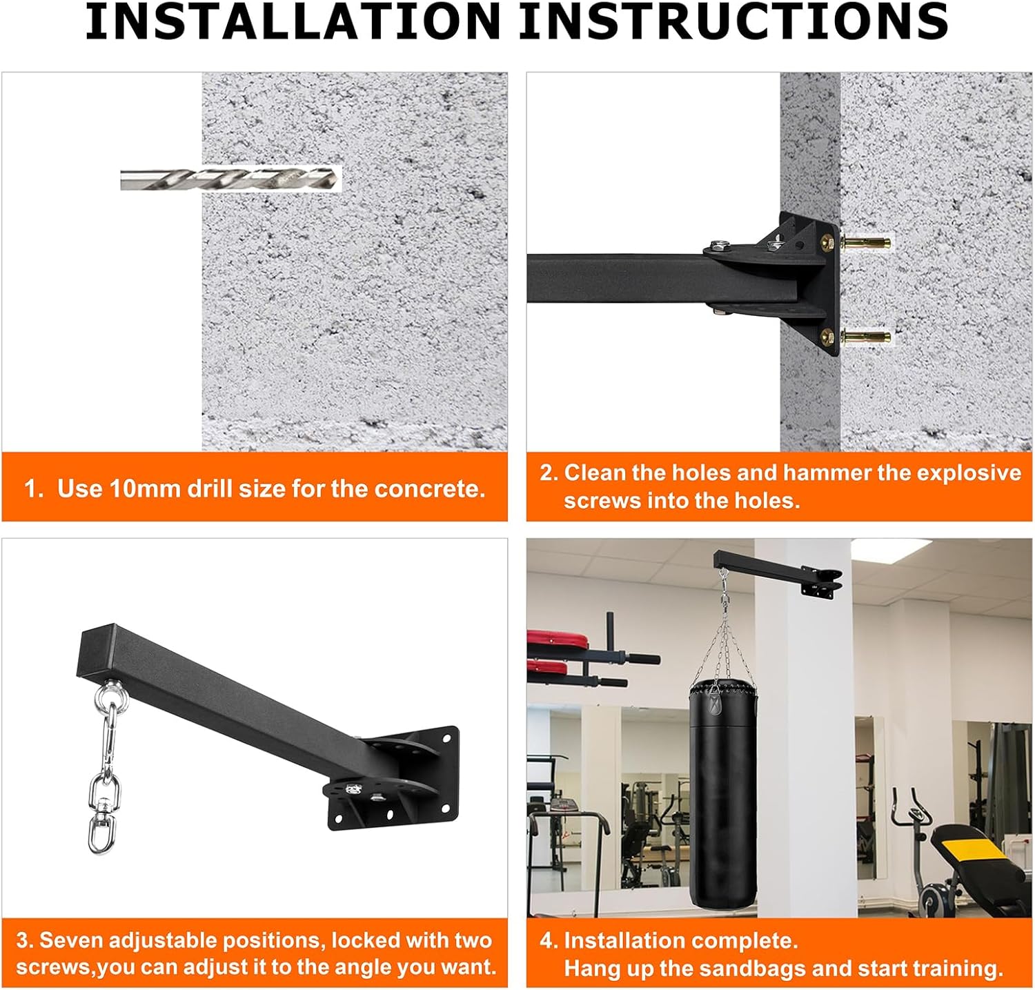 - Easy to install - Our punching bag holder come with 6 expansion bolts and a pins screw to adjust the Angle and a screw to lock the structure. A link nut, a rotating ring and a figure eight ring, simply hung on any concrete or wooden surface, can be installed in a few minutes.