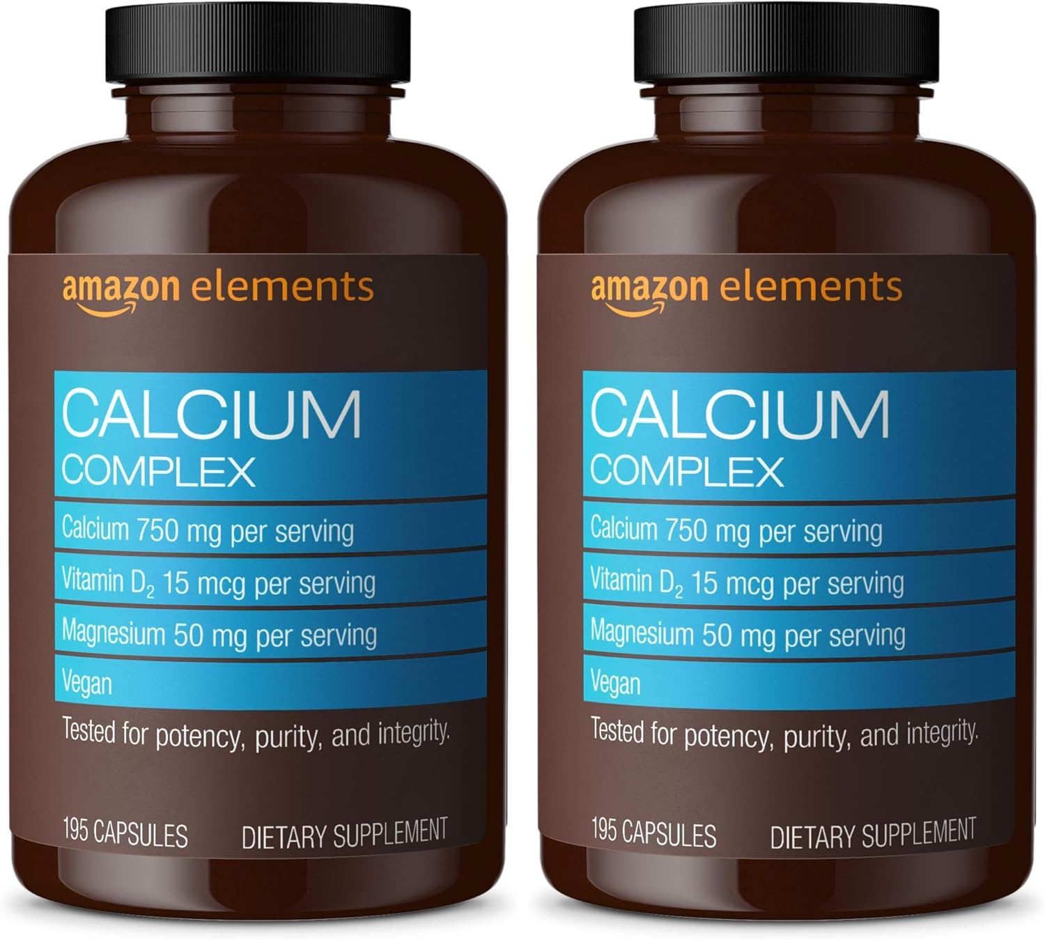 Amazon Elements Calcium Complex with Vitamin D, 250 mg Calcium (3 per Serving), Vegan, 195 Capsules (Packaging May Vary), Supports Strong Bones and Immune Health (Pack of 2)