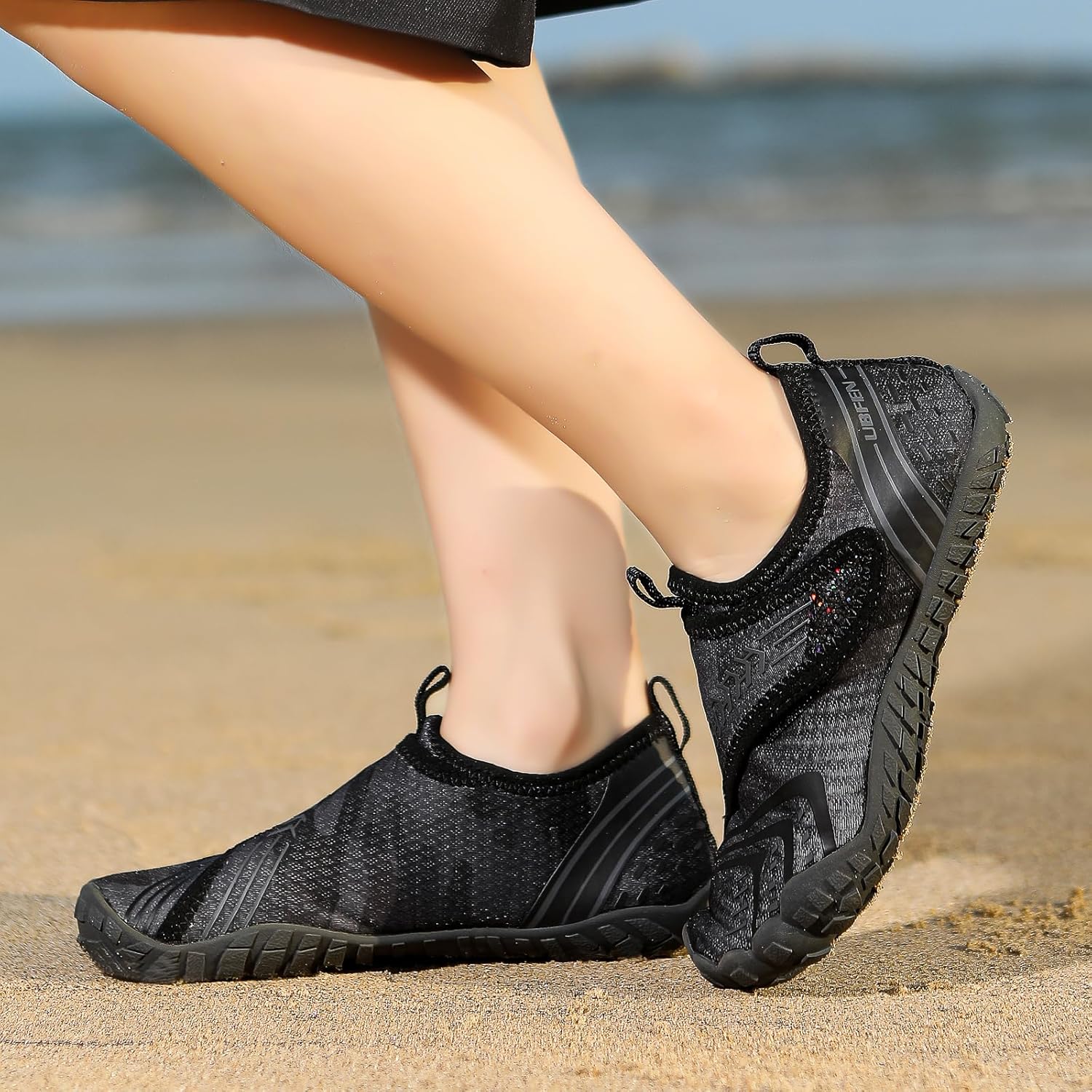 - Barefoot-Like Experience: These water shoes offer a soft and elastic feel, giving your kids the freedom to move and play comfortably. The toe design ensures a natural and barefoot-like experience, promoting healthy foot development.