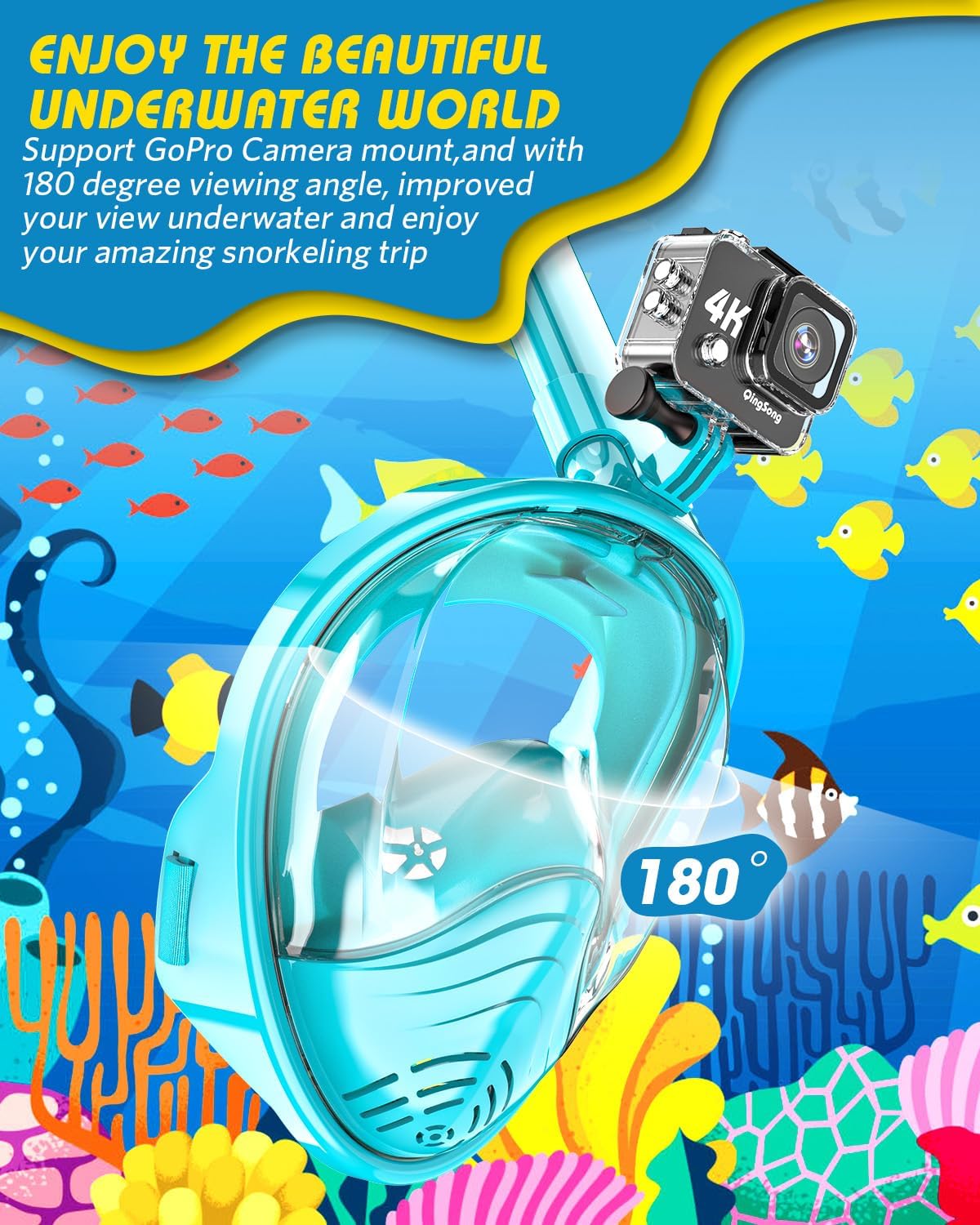 QingSong Kids Snorkel Mask Full Face, Snorkeling Set with Camera Mount, Foldable 180 Degree Panoramic View Snorkeling Gear Anti-Fog Anti-Leak