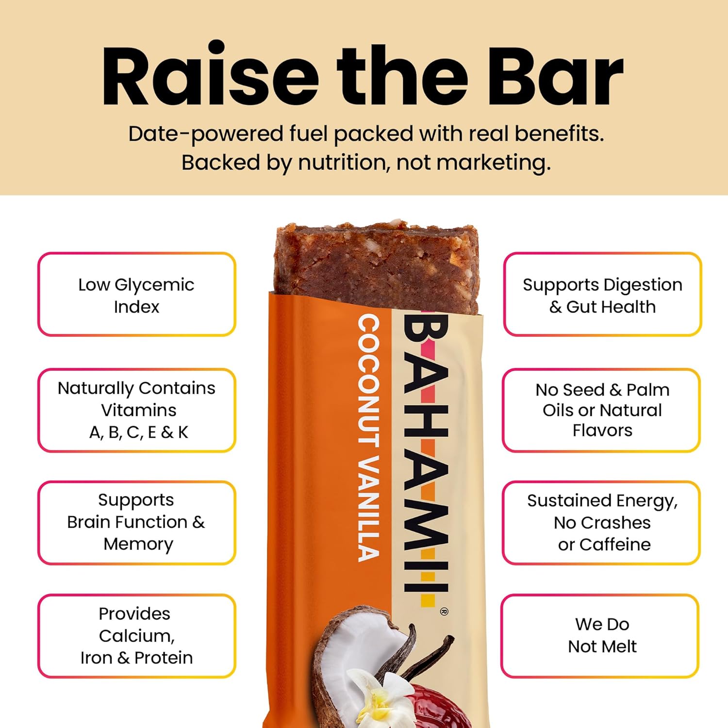Bahamii Almond Nut & Date Bars - Coconut Vanilla, 12 Pack, Only 6 Ingredients, Soft & Delicious Snack Bar with Almonds, Dates, Organic Coconut, Vanilla, Sea Salt, Diabetic Snacks, Gluten Free, Vegan