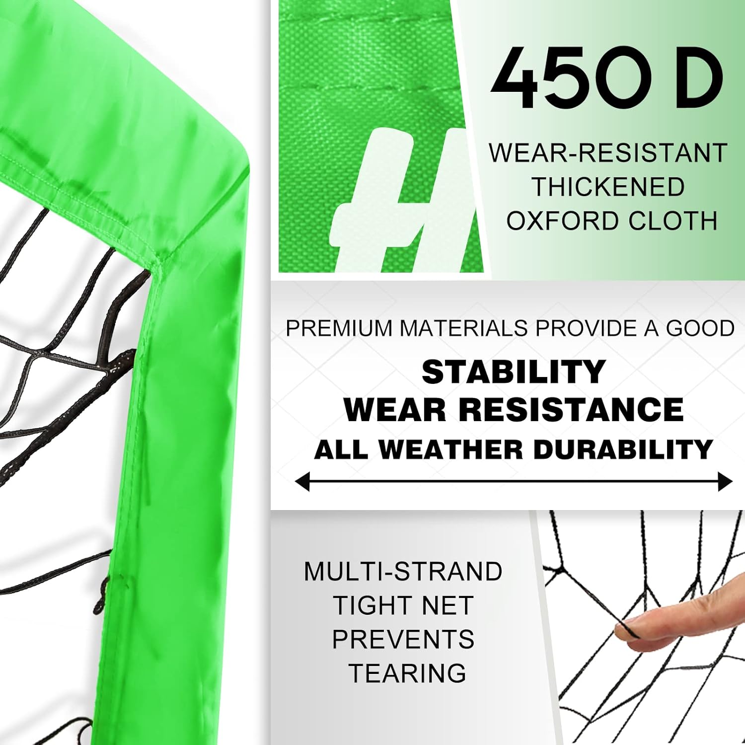 - 【Long-lasting Thickened Material】 The soccer goal is made of 450D thickened oxford cloth, 10mm high elastic fiberglass pole and strong 3-layer polyester soccer net. This ensures exceptional performance even against powerful shots, maintaining its all-weather durability and it won't fade or wear even if it is placed outdoor for a long time.