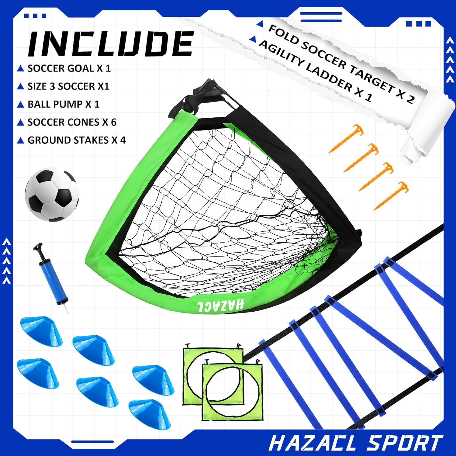 - 【Complete Gift Set】 This is a complete youth soccer goal training equipment set, including 1 x soccer nets, 1 x size 3 soccer ball, 1 x agility ladder, 6 x agility cones, 2 x target, 4 x ground stakes, 1 x air pump and 1 x storage bag. Meet kids' soccer practice and indoor or outdoor game needs.