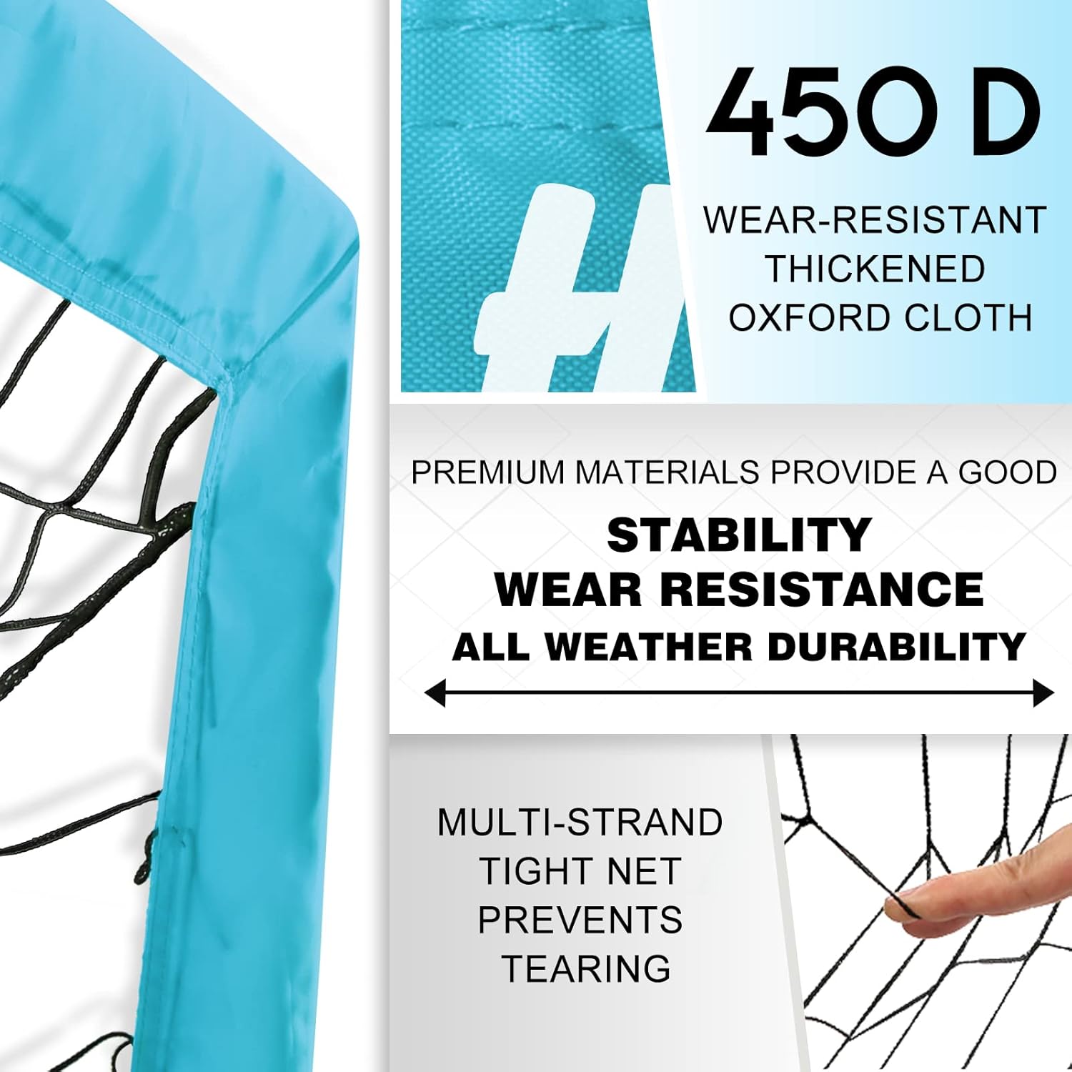 - 【Long-lasting Thickened Material】 The soccer goal is made of 450D thickened oxford cloth, 10mm high elastic fiberglass pole and strong 3-layer polyester soccer net. This ensures exceptional performance even against powerful shots, maintaining its all-weather durability and it won't fade or wear even if it is placed outdoor for a long time.