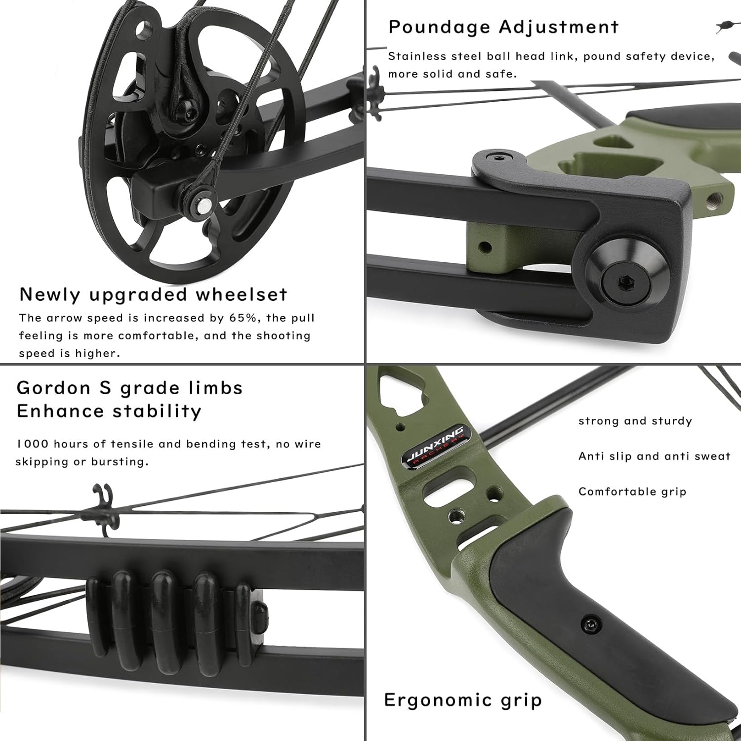 - 【Limbs & Cams & Modules】Adopt Gordon limbs, which are made in USA, the bow limbs are well made with lightweight high strength fiberglass board, which is even and smooth, making the bow more powerful.The compound bow riser is made of aluminum alloy, which is strong and durable.The rubber handle is on the outside for improved comfort.