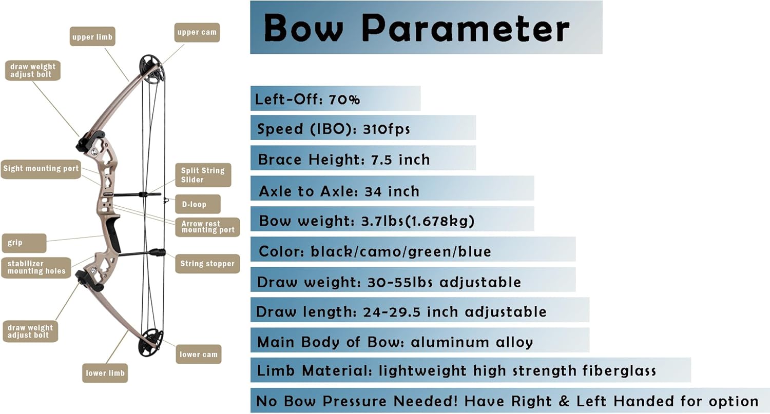 - 【Bow Parameter】IBO 310 fps ; Axle to Axle: 34"; Draw Weight: 30-55lbs Adjustable, Draw Length: 24" -29.5" Adjustable, Brace Height: 7.5", Upgrade Bow Cams, the Let-off could be reached 70%! Please read the guide manual carefully before adjusting the DRAW LENGTH & DRAW WEIGHT.
