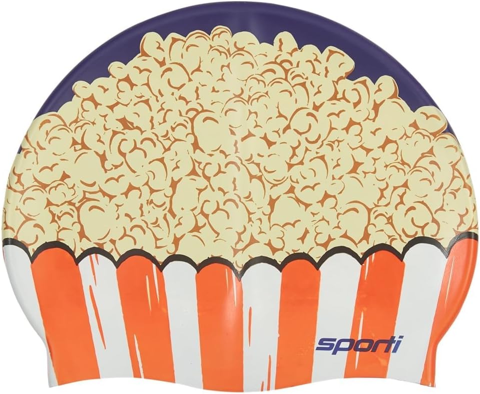 - SILICONE POPCORN PATTERNED SWIM CAP: Bring the fun of the movies to the pool with this kid-friendly swim cap featuring a popcorn-themed print