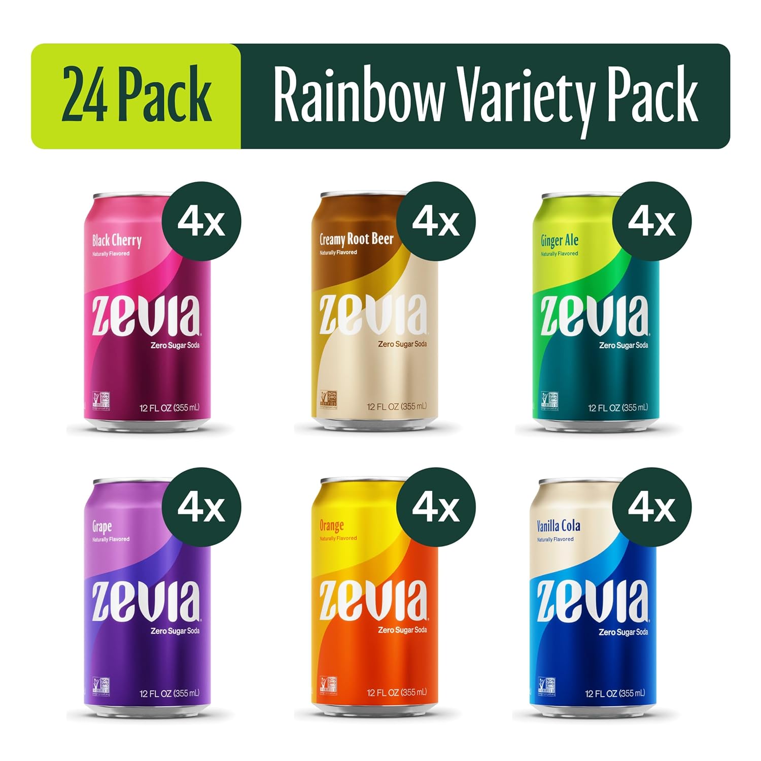 Zevia Zero Sugar Soda, Rainbow Variety Pack, 12 oz Cans (24-Pack) – Naturally Sweetened, Non-GMO Project Verified, Gluten-Free, Vegan