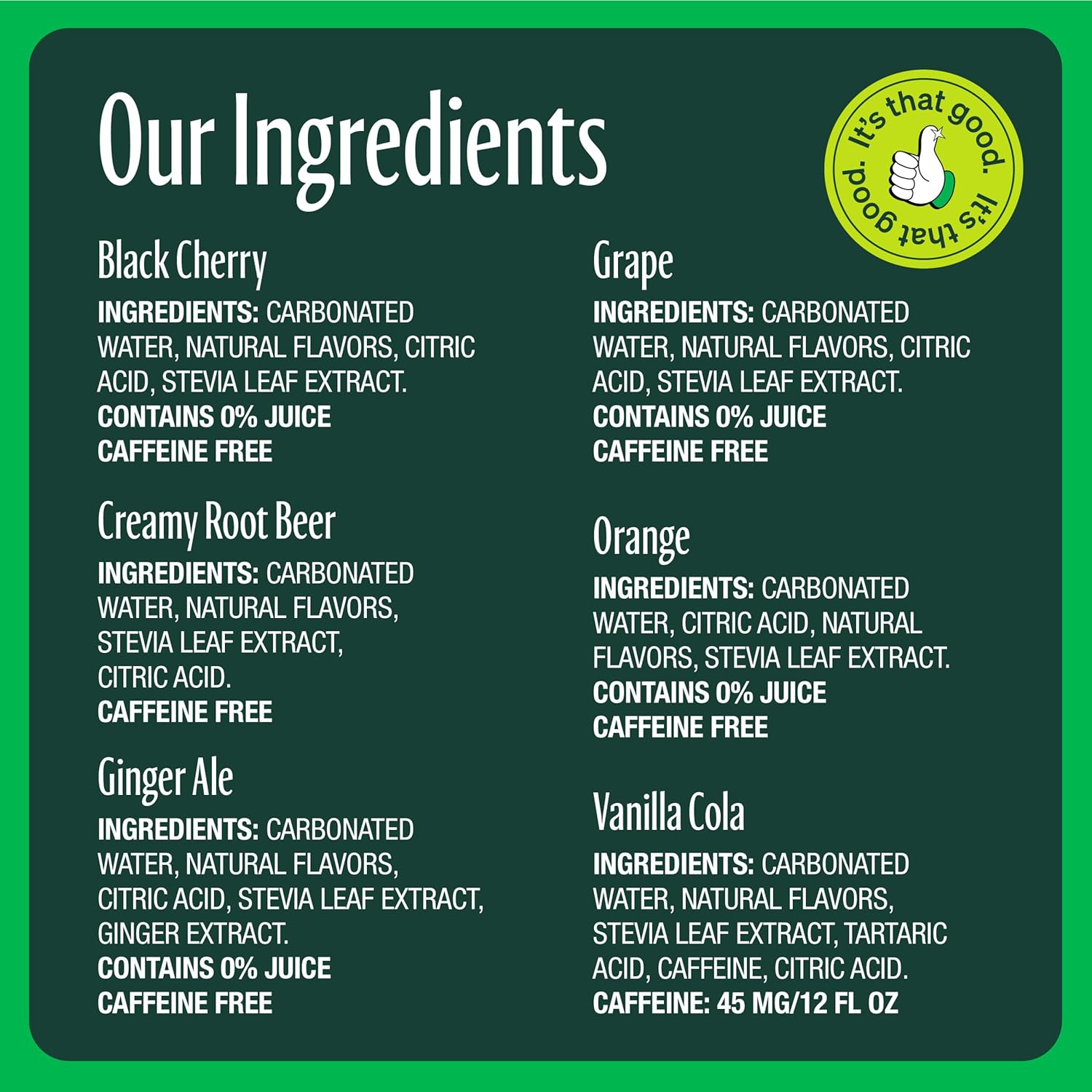 - 4 Cans of Each: Orange, Black Cherry, Ginger Ale, Grape, Creamy Root Beer, Vanilla Cola
