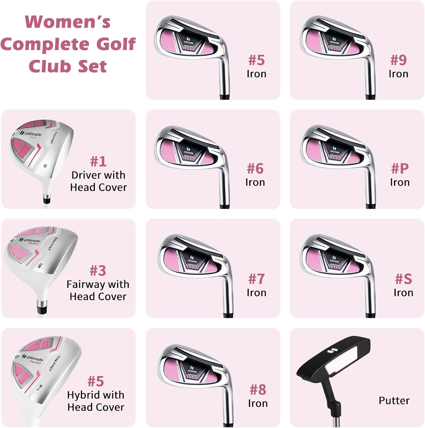 - Womenโs Complete Golf Club Set: This golf club set includes all the essential clubs for a successful and enjoyable golfing experience: #1 driver with head cover, #3 fairway with head cover, #5 hybrid with head cover, #5 #6 #7 #8 #9 #P #S irons and a putter. The included cart bag with a shoulder strap and 3 handles is designed to provide versatility and portability on the course.