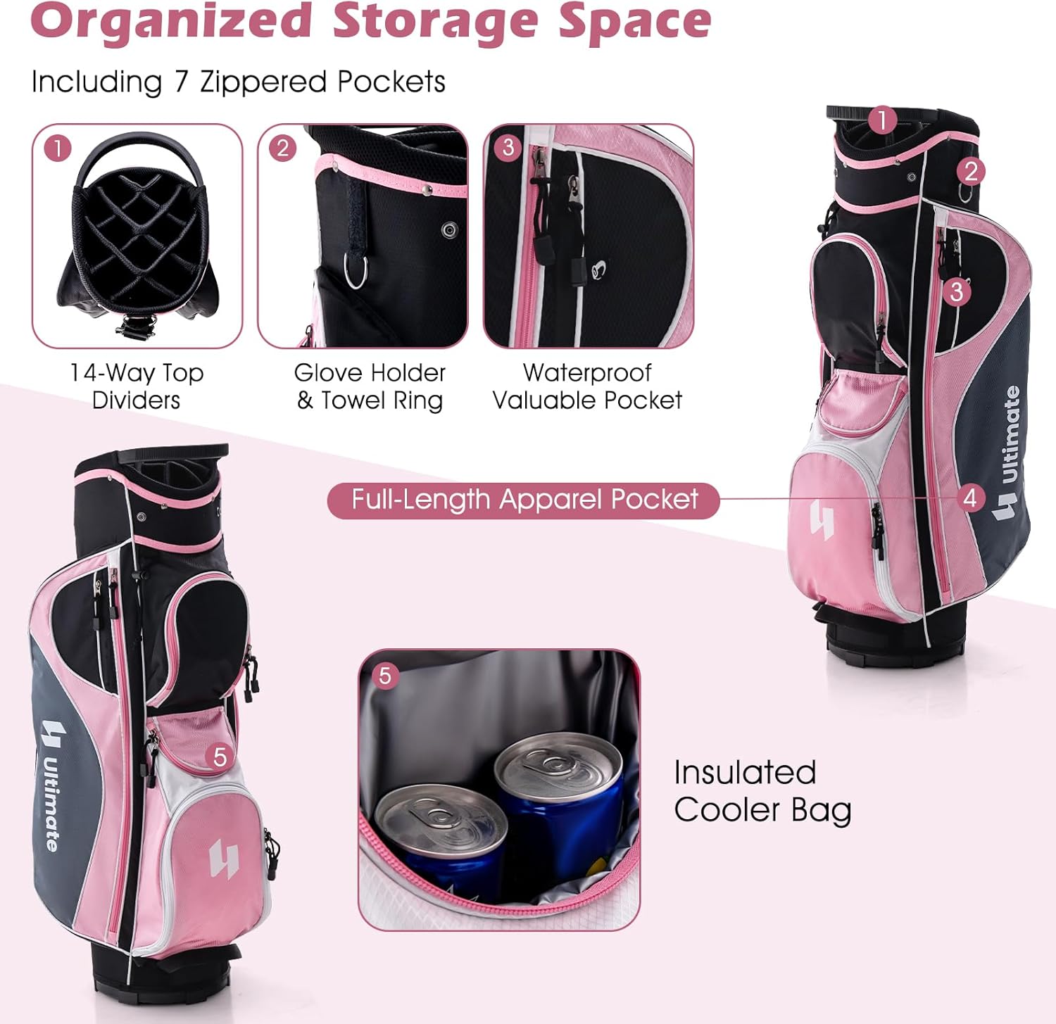 - Convenient Cart Bag: The bag provides organized storage space including 14-way top dividers and 7 zippered pockets for your clubs and gear. The zippered rain hood is also dust-proof and sun-proof, which protects the clubs from the elements. The umbrella holder with 2 holders makes sure you are ready for rain days.