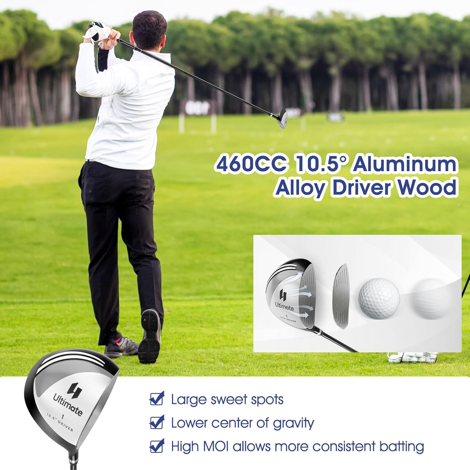 - 【Men's 9-Piece Complete Golf Clubs Set】Elevate your game with ULTIMATE’s premium men’s golf set, featuring essential clubs for every shot. The set includes a #1 driver, #3 fairway wood, #4 hybrid, and #6, #7, #8, #9 irons, plus a pitching wedge and a precision putter. Expertly crafted for right-handed male golfers seeking a perfect blend of performance and value in a single comprehensive package.