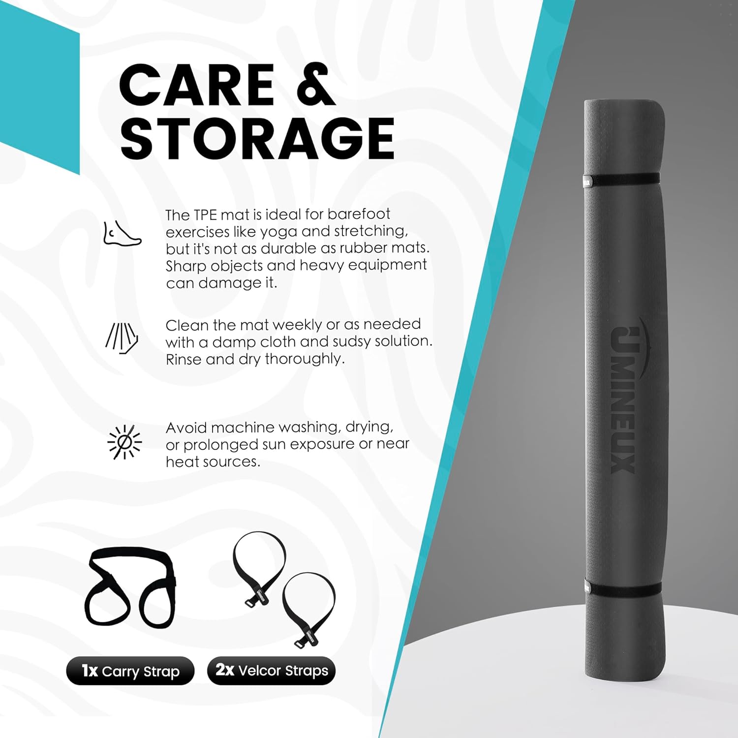 - Product Care Instructions : 1. Hand wash only 2. Wipe clean with damp cloth, unroll, and air dry 3. Store out of direct sunlight 4. Designed for barefoot exercise. Your shoes or your pets' paws may tear the mat. 1. Hand wash only 2. Wipe clean with damp cloth, unroll, and air dry 3. Store out of direct sunlight 4. Designed for barefoot exercise. Your shoes or your pets' paws may tear⦠See more