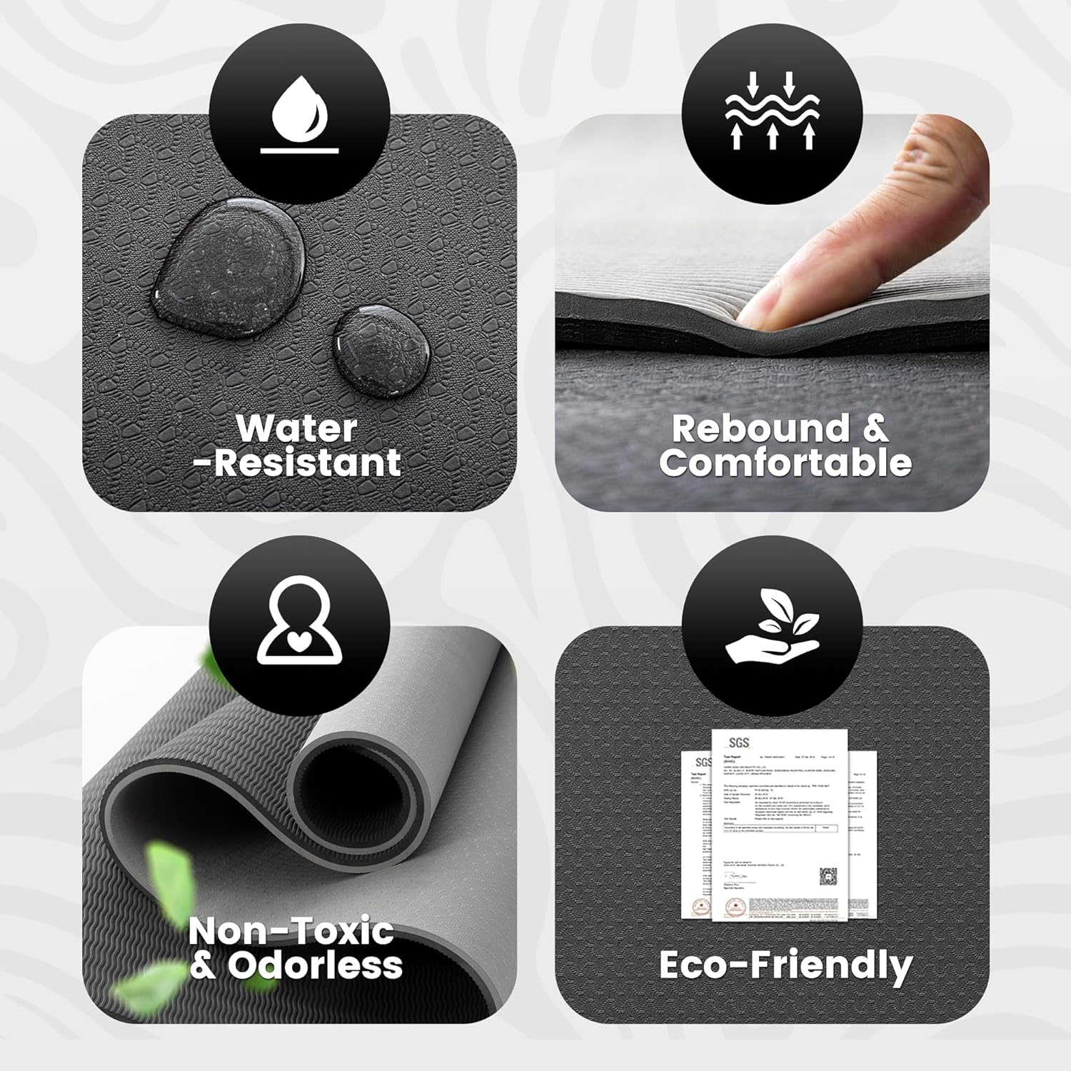 - Upgraded TPE Material: Crafted from premium TPE material, this big home gym mat is free from phthalates and has no unpleasant smell. Compared to NBR and PVC mat, TPE has a nice density. It provides ample cushioning without excessive sinking, aiding in the maintenance of balance during your practice.
