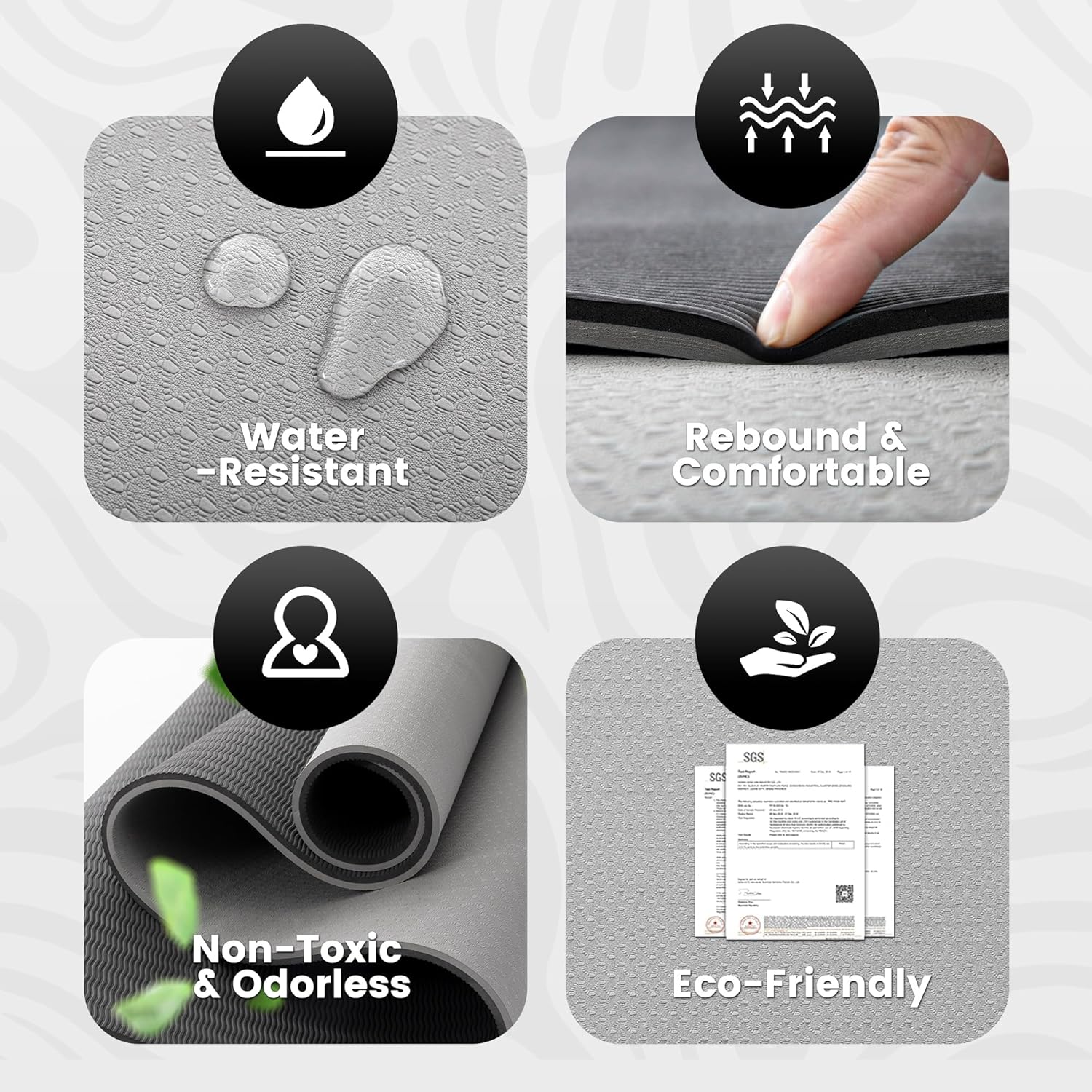 - Upgraded TPE Material: Crafted from premium TPE material, this big home gym mat is free from phthalates and has no unpleasant smell. Compared to NBR and PVC mat, TPE has a nice density. It provides ample cushioning without excessive sinking, aiding in the maintenance of balance during your practice.