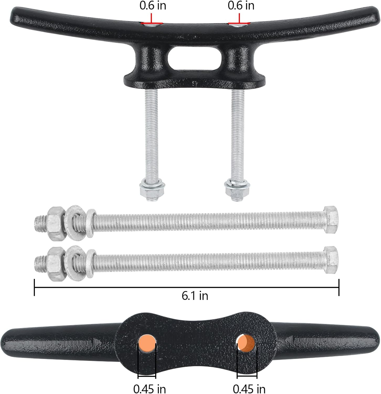 - 【Cleat Size & Bolts】These boat cleats have a size of 10 inches in length and 2.6 inches in height, with a base measuring 4 inches x 1.6 inches. The mounting holes are spaced 2.5 inches center to center. The dock cleats 10 inch with hardware, including M10x6 inch (152mm) bolts and nuts. The cleats for boat dock are designed to be a perfect size to fit any use, and if needed, the bolts can be cut to the desired length