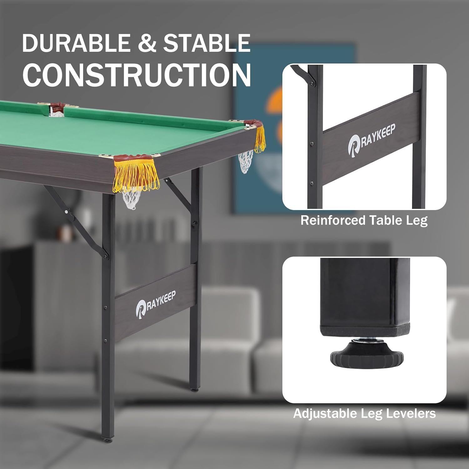 - 【FOLDABLE TABLE LEGS】the rectangular small pool table adopts a space-saving design, pool table legs can be folded quickly for easy carrying and storage. You can store it with a flat surface under the bed or lean against the wall. It is great for use in any basement, children's adult playroom or any corner.