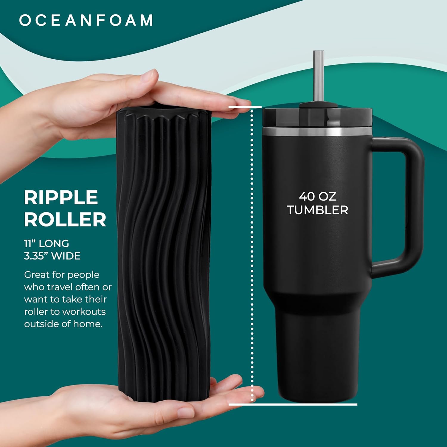 Oceanfoam Ripple Travel Foam Roller (11" x 3.35") Firm Mini Foam Roller for Physical Therapy, Deep Tissue Massage, Back Pain - High Density, Ergonomic Wave Textured - Yoga, Pilates, Exercise (Black)