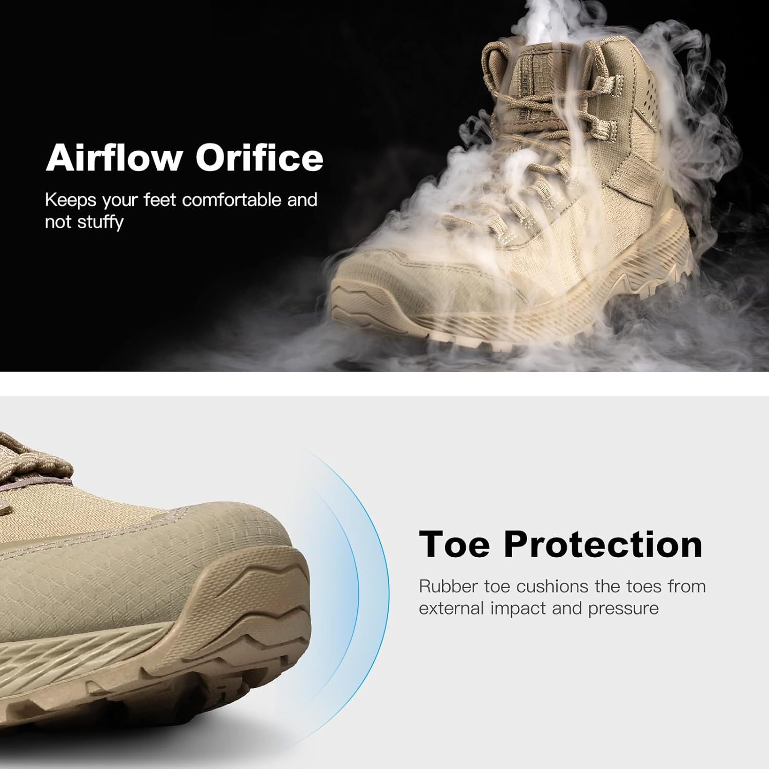 - COMPREHENSIVE PROTECTION & SHOCK ABSORPTION - Feature 3D pressure embossing designs on the toe and heel, which protect your feet from impacts and collisions during various activities. The strong support and ankle protection ensure your feet are safe and comfortable. The EVA midsole provides excellent cushioning and support for long-lasting comfort. Anti-slip shoelaces ensure a secure fit, while the integrated tongue design prevents dust, sand, and debris from entering the boots.