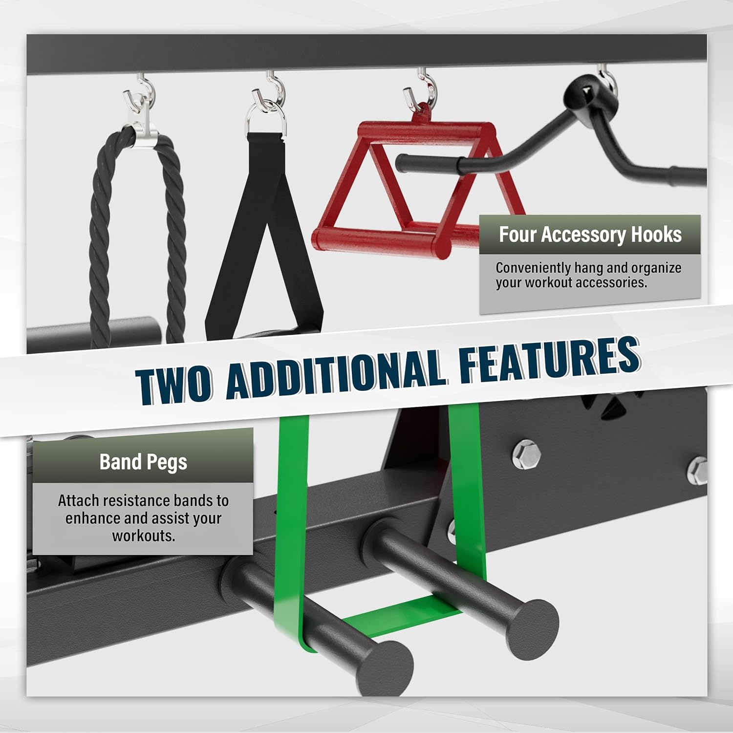 - Abundant Exercise Accessories: Safety arms, foot pedals, J-hooks, landmines, dip bars, T-bars, LAT bars, cable bars, and resistance band pegs are included in the package to make it easy for exercisers to train in various muscle areas. In addition, we have designed four storage hooks on this power cage to store these accessories.