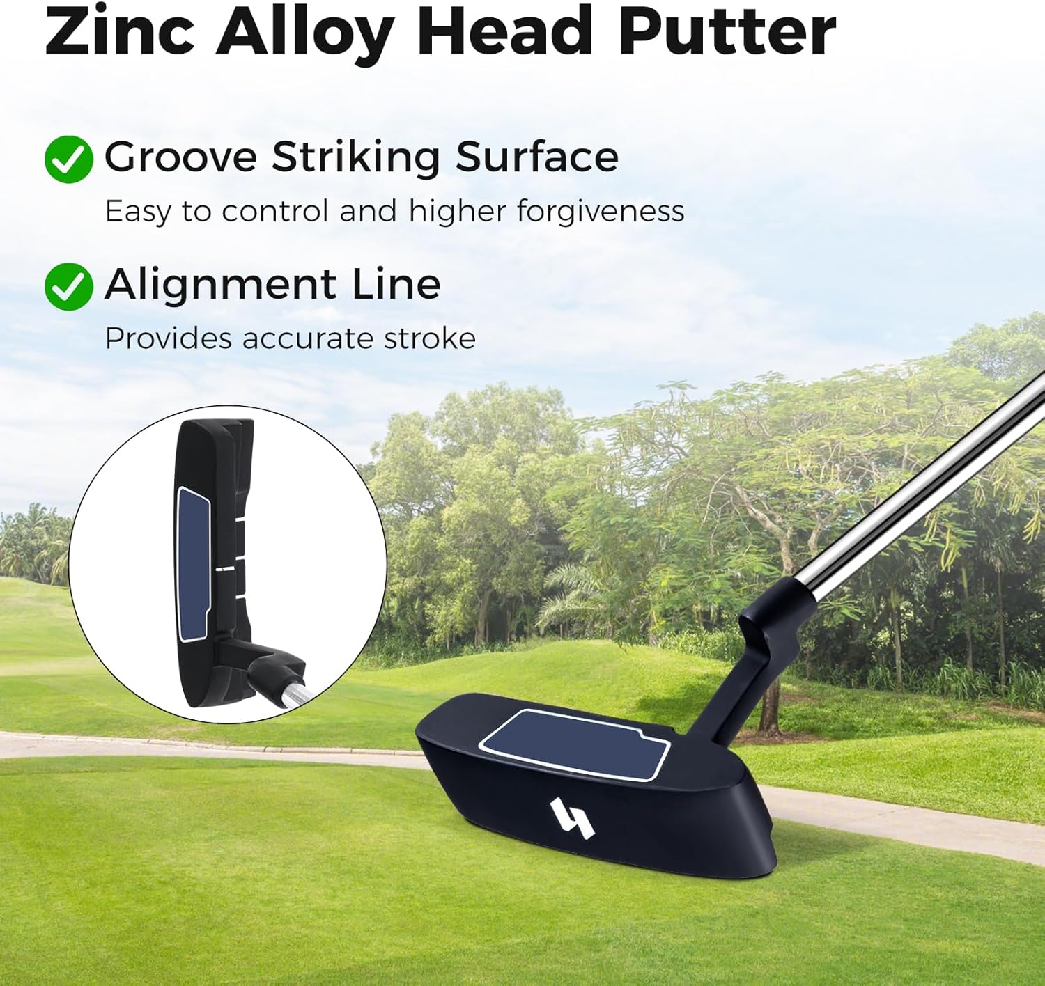 - ⛳【Putter with Aiming Design】 Designed with an alignment line, this well-made zinc alloy head putter keeps the golf ball on the line, providing accurate stroke for higher forgiveness on off-centre shots. Additionally, the groove striking surface of the golf club enhances the friction on impact, making it easier to control.