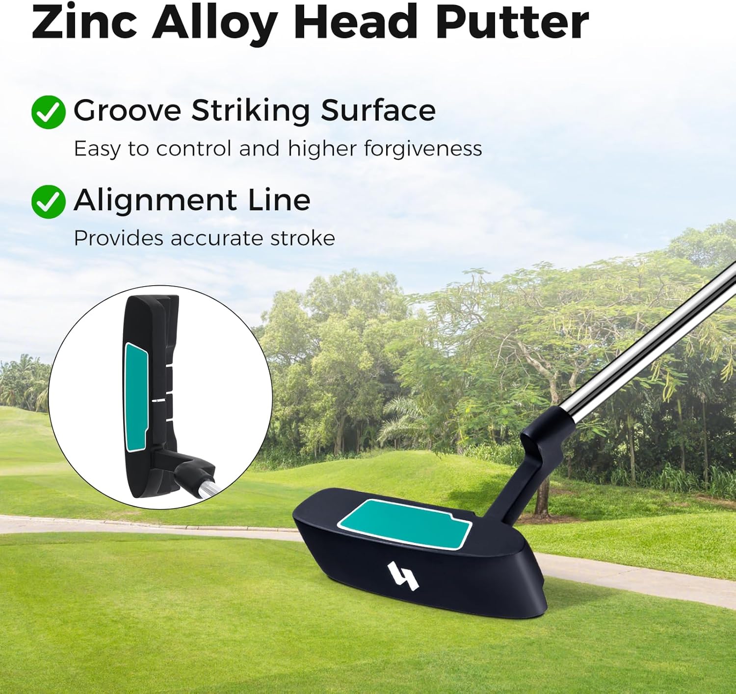 - ⛳【Putter with Aiming Design】 Designed with an alignment line, this well-made zinc alloy head putter keeps the golf ball on the line, providing accurate stroke for higher forgiveness on off-centre shots. Additionally, the groove striking surface of the golf club enhances the friction on impact, making it easier to control.