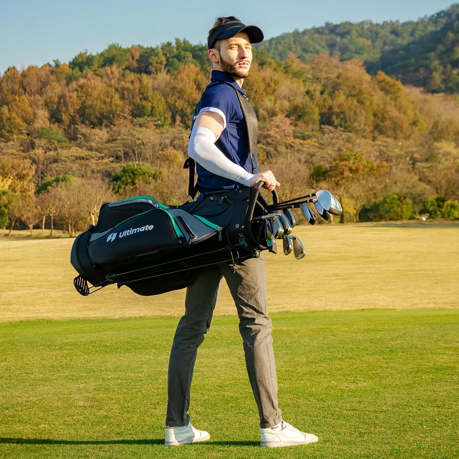 - 🏌️【Convenient & Multi-functional Golf Bag】 This golf bag features 5 top-way dividers and 7 zipped pockets for organized club and equipment storage. Furthermore, the adjustable and detachable straps with portable TPR handle and ergonomic waist support cushion provide a more comfortable carrying experience. Plus, the waterproof rain hood and umbrella holder are ready for rainy day practice.