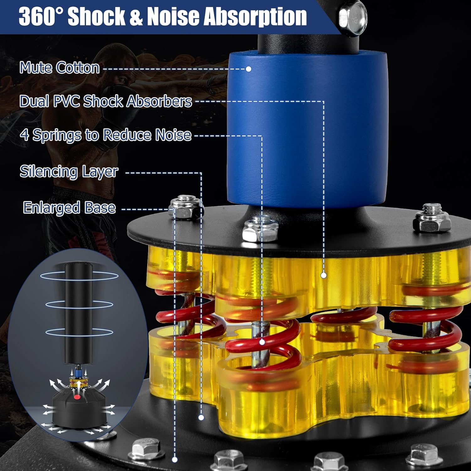 - Shock-Absorbing System: Equipped with a specialized shock absorbing system, the boxing bag minimizes impact and vibrations, reduces noise level and strain on your joints, as well as minimizing the risk of injuries.