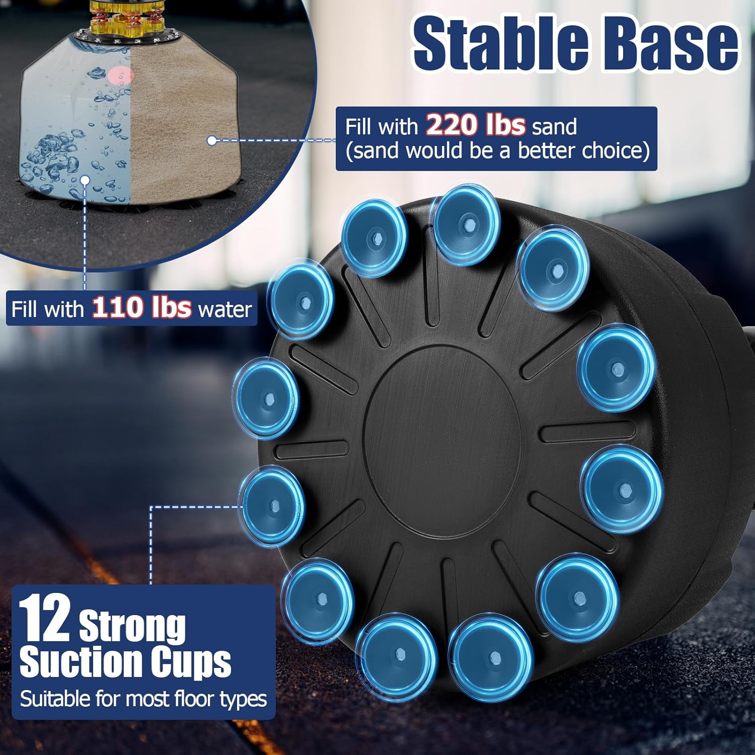 - Fillable Base with Suction Cups: The base of this punching bag is fillable with 220 lbs sand or 110 lbs water, offering stability and support during your training. The integrated suction cups ensure additional security, preventing the bag from sliding or tipping over during vigorous workouts.