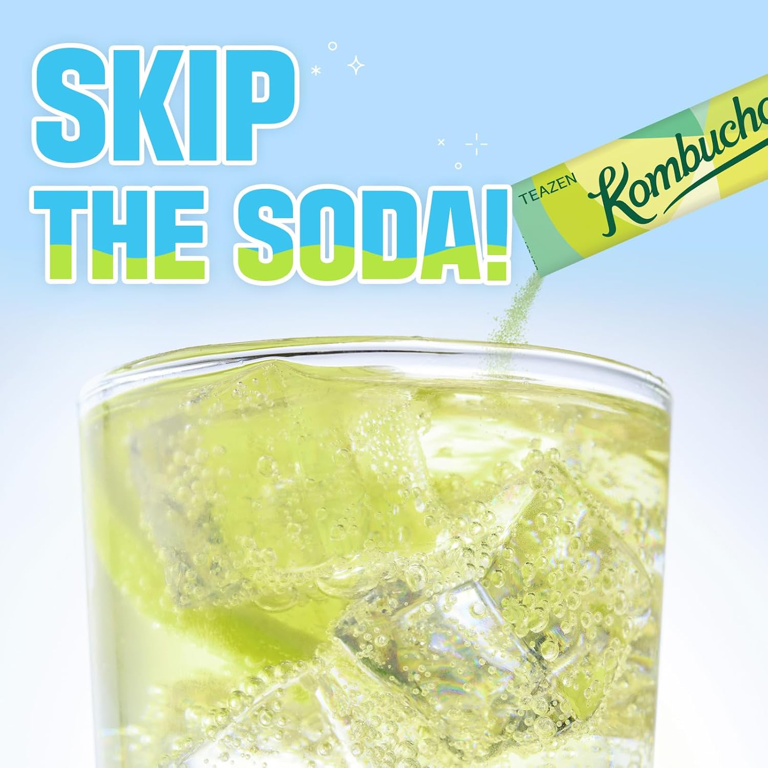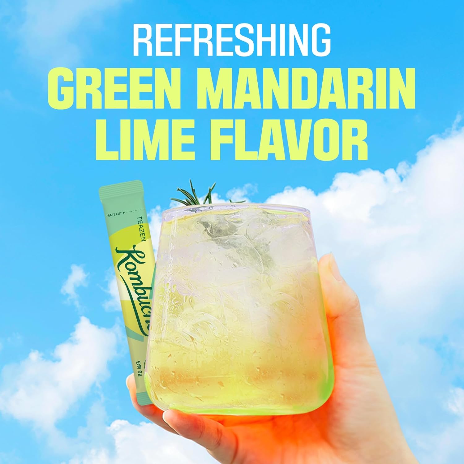TEAZEN Green Mandarin Lime Kombucha Tea, Hydration Drink Mix, Sugar Free, Live Probiotics & Prebiotics, 10 Sticks, 1.76oz