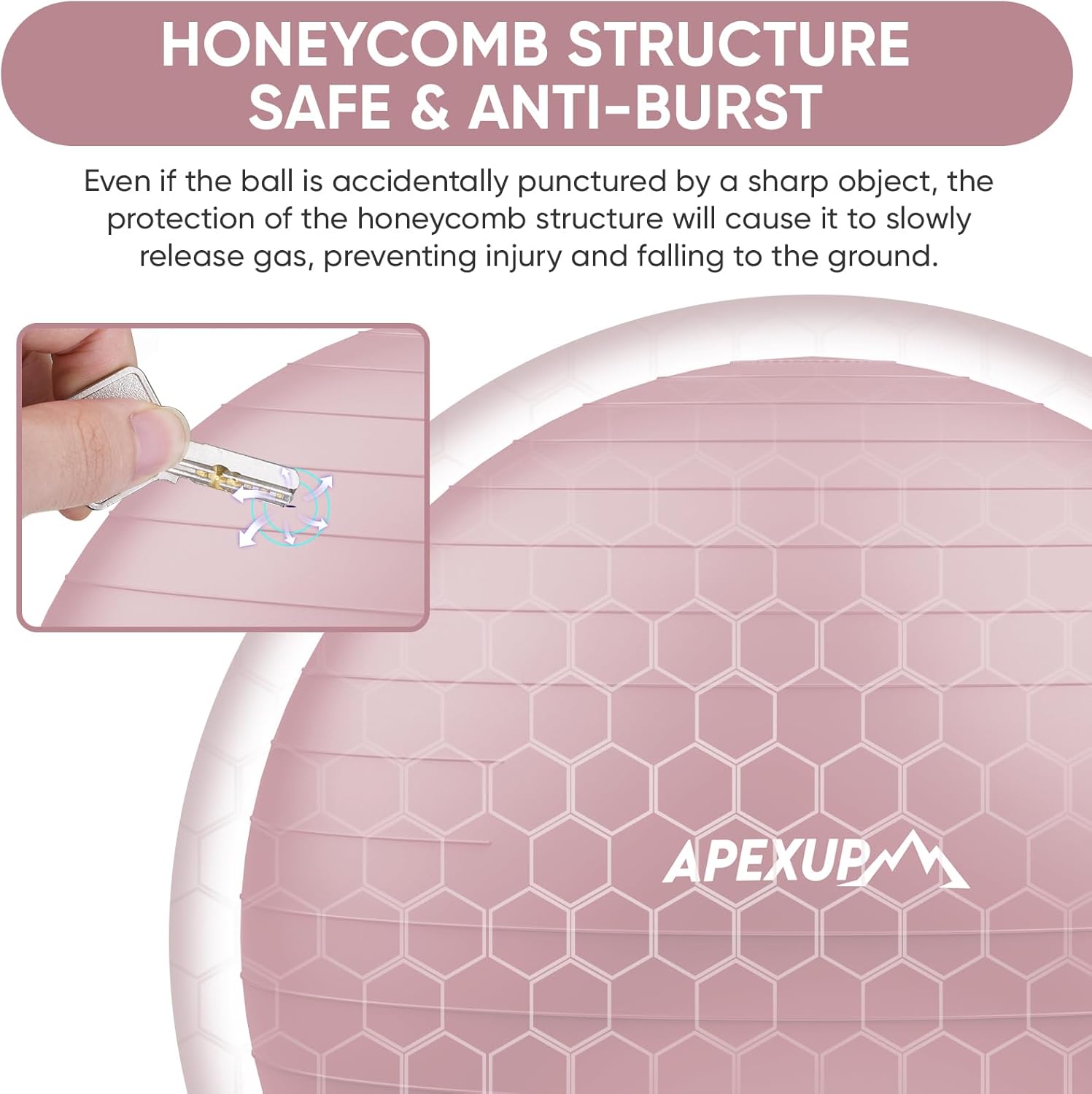 - [SAFE & ANTI BURST] APEXUP Exercise ball is made of high-quality, eco-friendly PVC material, which meets stringent safety standards. It's non-toxic, odorless, and free from harmful heavy metals. With an anti-burst honeycomb structure, it ensures durability and safety during your workouts.