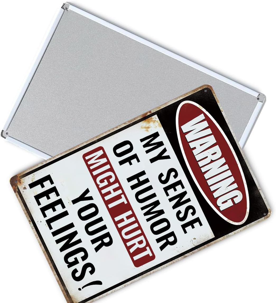 - Funny Bar Tin Signs, Size : 8 x12inch (20 x30cm). The bar metal sign reads: Waring, My Sense Of Humor Might Hurt Your Feelings.