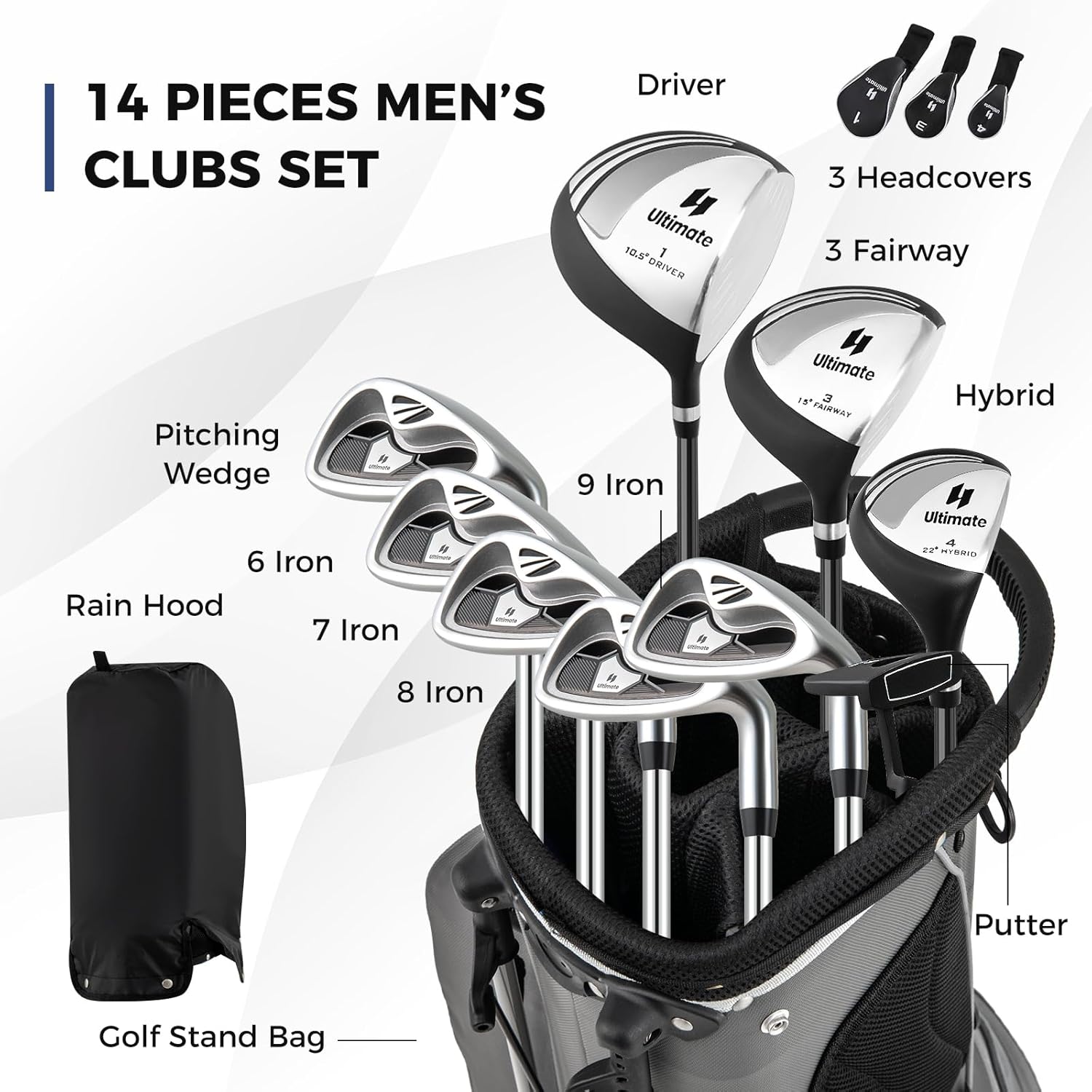 - 【Men's 9-Piece Complete Golf Clubs Set】Elevate your game with ULTIMATE’s premium men’s golf set, featuring essential clubs for every shot. The set includes a #1 driver, #3 fairway wood, #4 hybrid, #6, #7, #8, #9 irons, plus PW and putter, all neatly stored in a lightweight golf stand bag. Expertly crafted for right-handed male golfers seeking a perfect blend of performance and value in one comprehensive package.