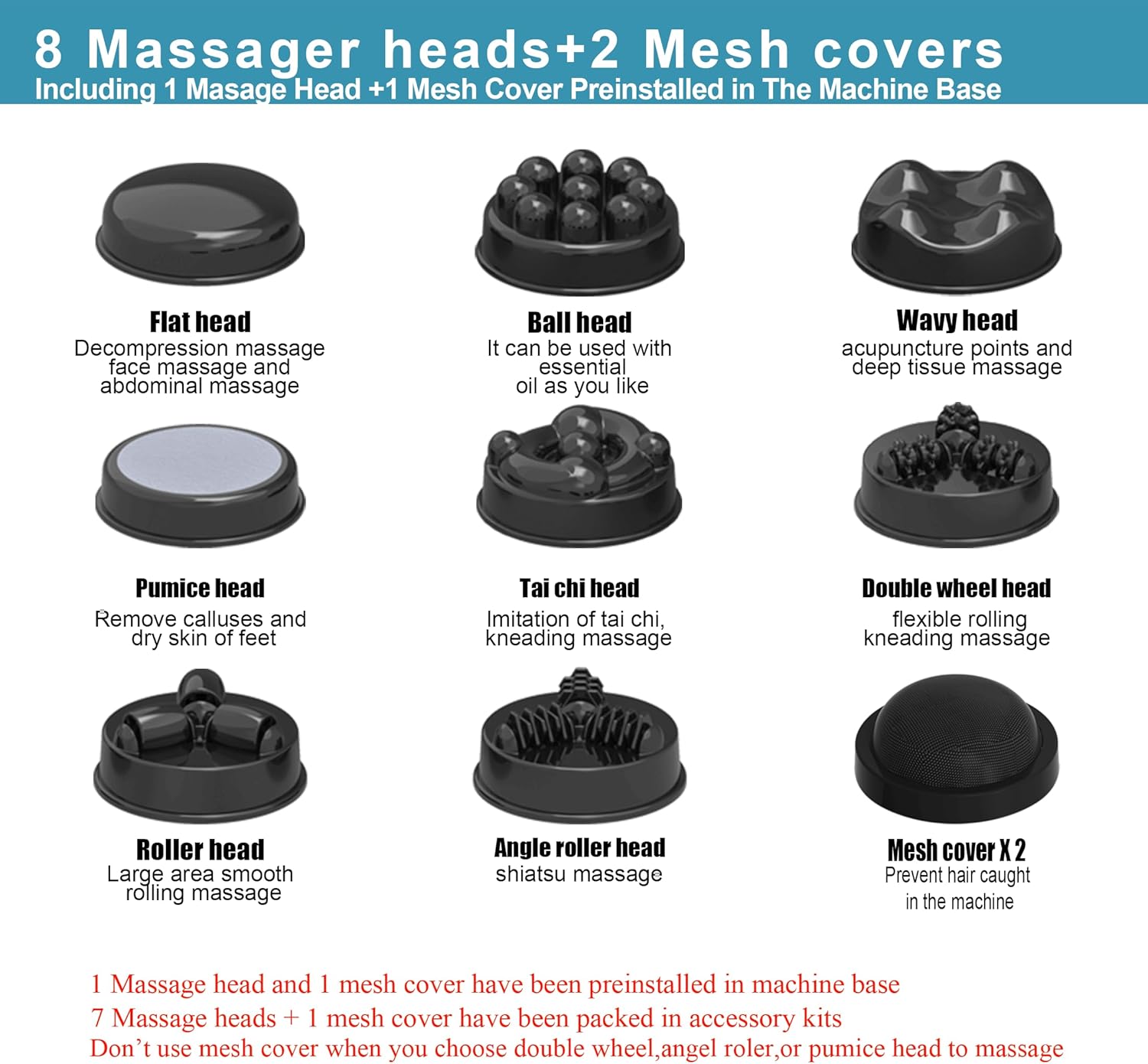 - ☑️【Full body massage】: Our cellulite massager comes with 8 interchangeable massage heads (1 in the machine base and 7 in the accessory bag)plus 2 mesh covers, allowing you to target various body areas, including the stomach, belly, abdomen, thighs, arms, legs, neck, back, shoulders, waist and buttocks, with ease.