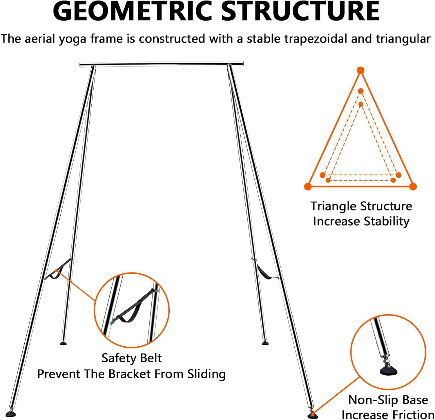 - Safe & Considerable Design: The yoga swing stand adopts overall triangular support design, it is stable and hard to fall apart. And the stand equipped with safety belt on both sides, which greatly Improve its slip resistance. The four feet also take the non-slip design. All these protection make sure our user have a safe and comfortable experience.